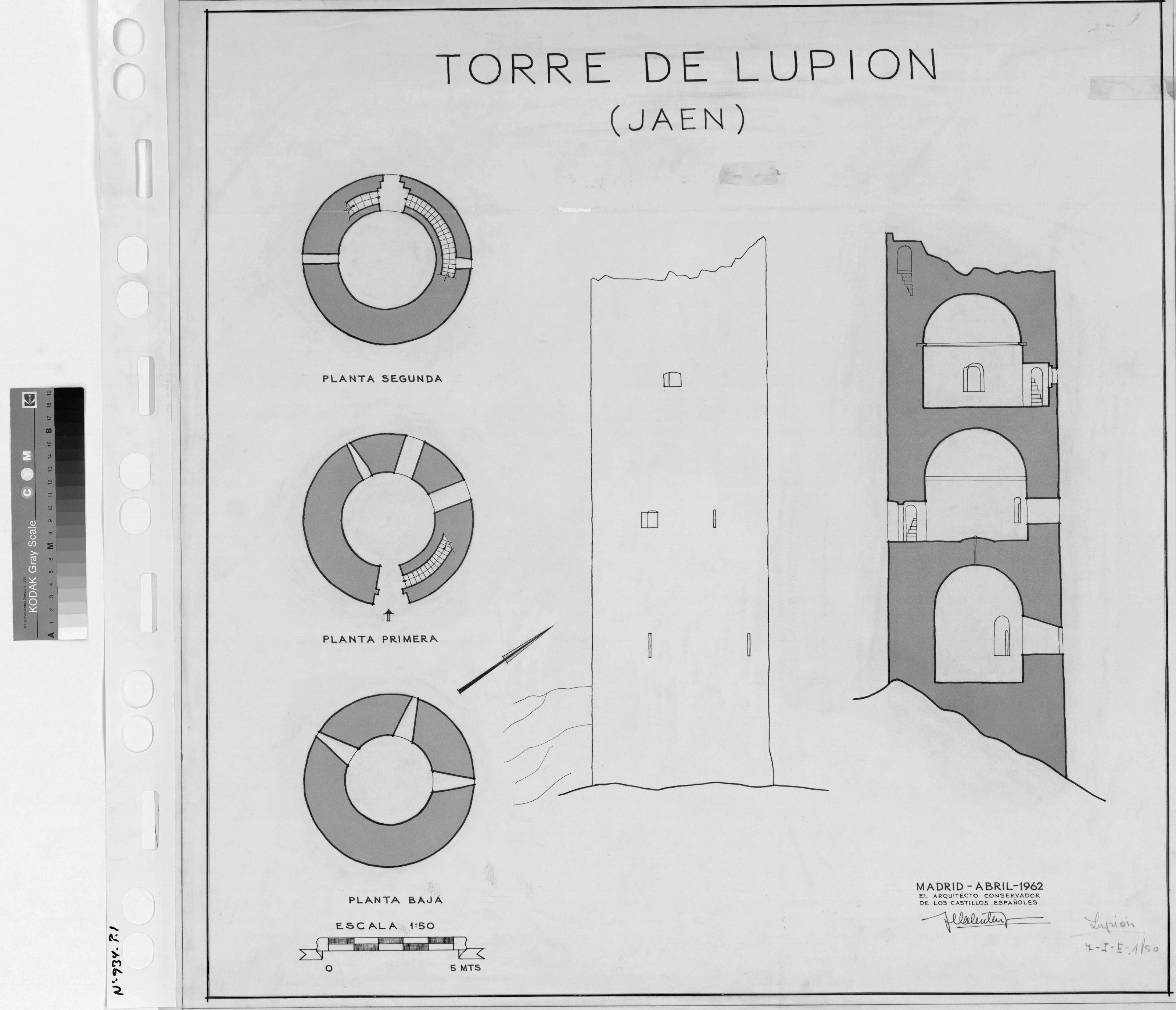 TORRE DE LUPION. JAEN: PLANO DE LA TORRE CON : PLANTA BAJA, PRIMERA Y SEGUNDA, ALZADO , Y SECCION . Muros regruesados y sin escala.