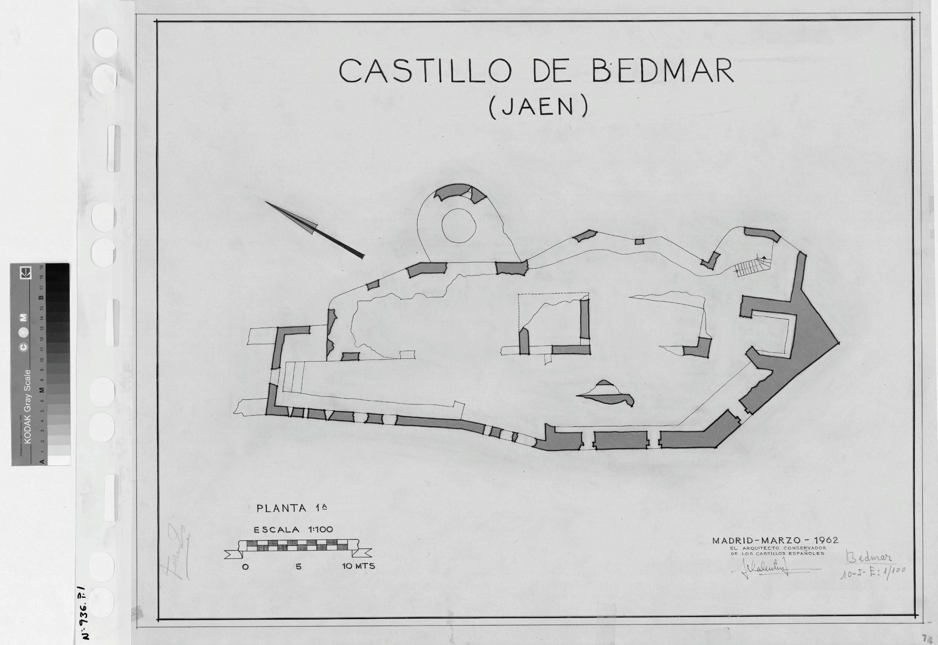 CASTILLO DE BEDMAR . JAEN: PLANO DE PLANTA, Planta primera, plano con el perimetro del castillo dibujado, señala los muros regruesados, y los derruidos.plano sin cotas.