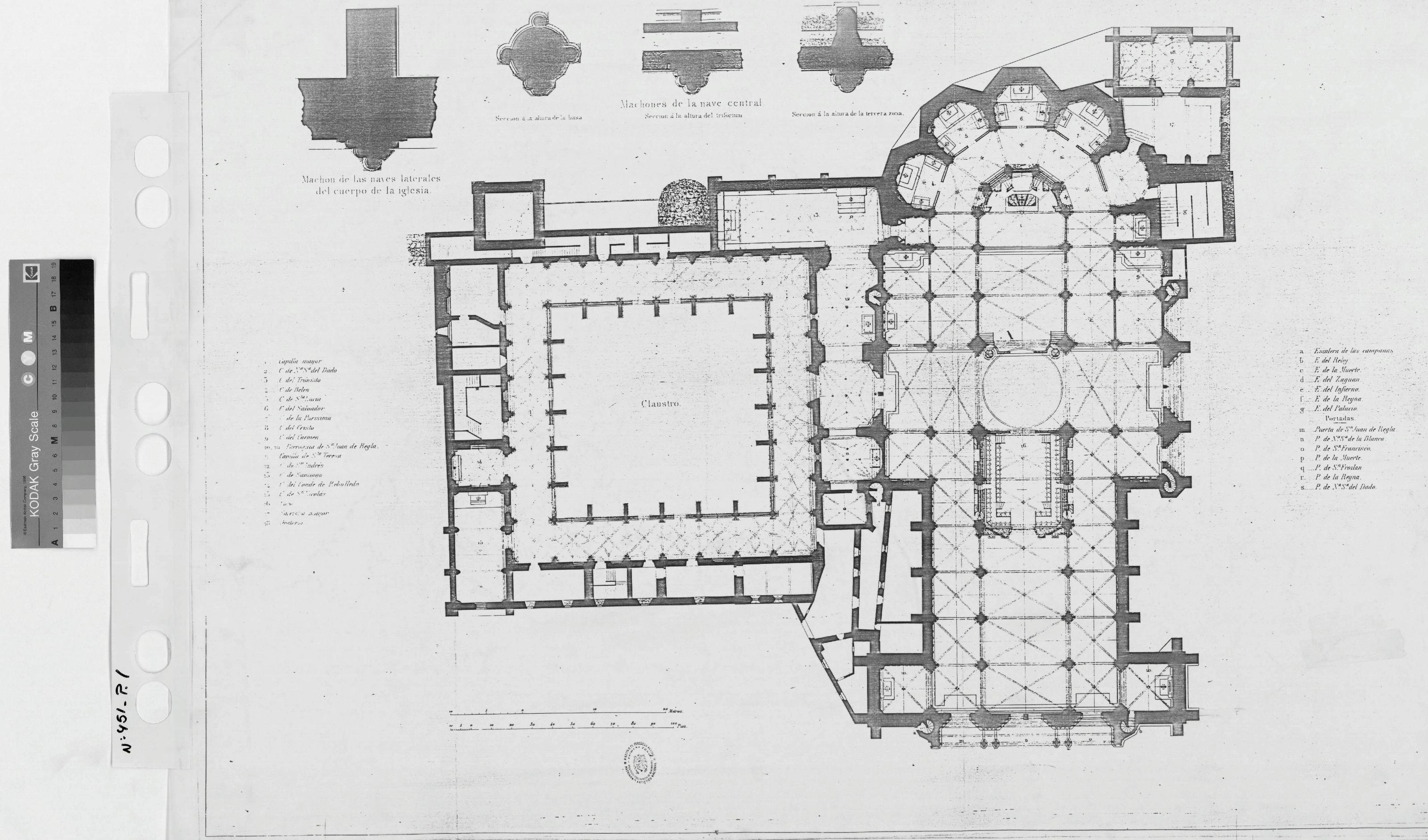 CATEDRAL DE LEON: PLANTA Con proyección de bóvedas, así como 4 detalles de machón. Cuenta con tres leyendas: Capillas, Escaleras y Puertas. Tiene también escala gráfica. Sin sello , sin cotas y sin firmar.