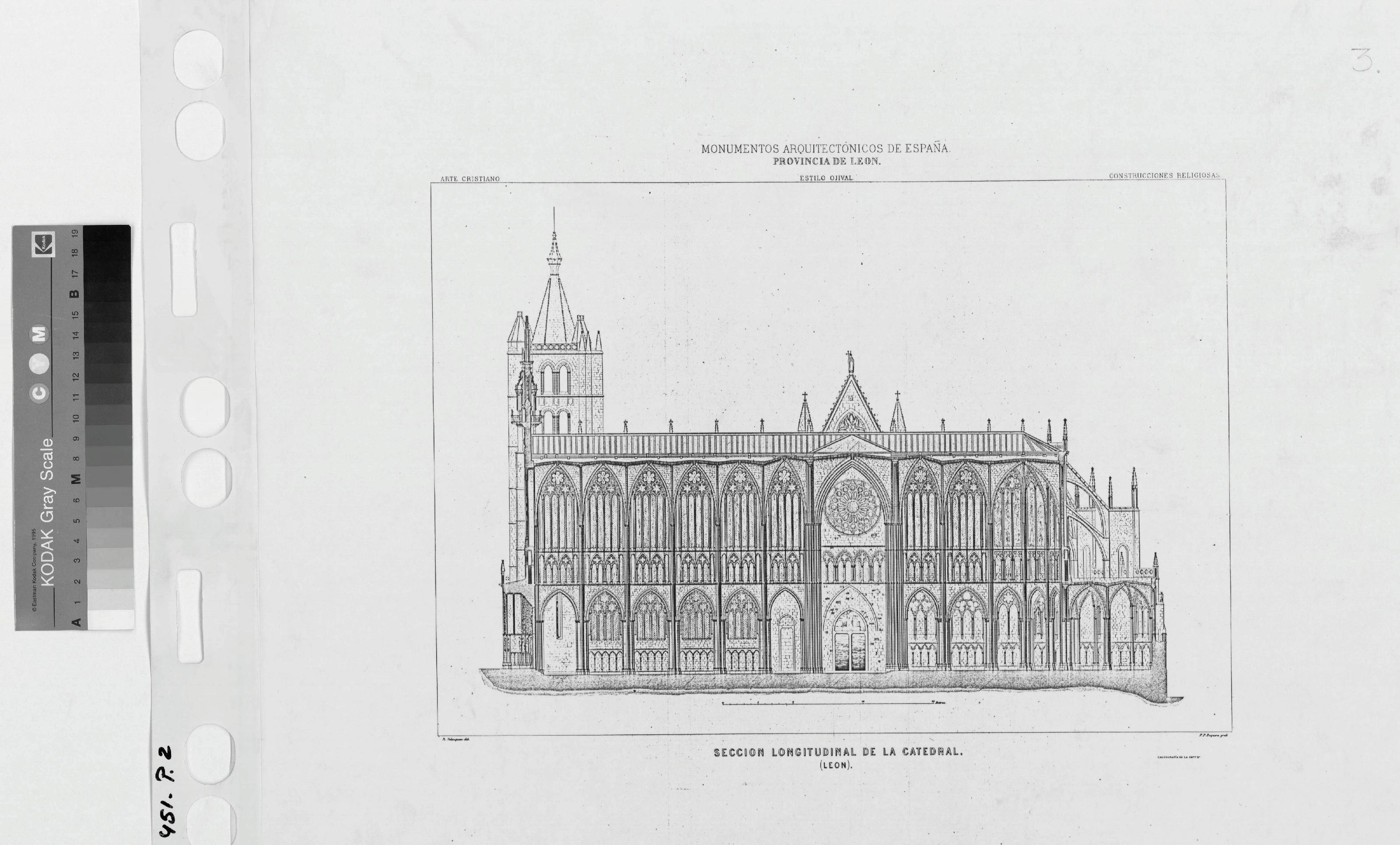 CATEDRAL DE LEON: SECCION LONGITUDINAL Parece que corresponde a una serie - tiene un encabezamiento que dice: MONUMENTOS ARQUITECTONICOS DE ESPAÑA - PROVINCIA DE LEON - Estilo Ojival - Arte cristiano - construcciones religiosas. Con despieces y proyecciones del fondo. Aparece la torre vieja. Con escala gráfica