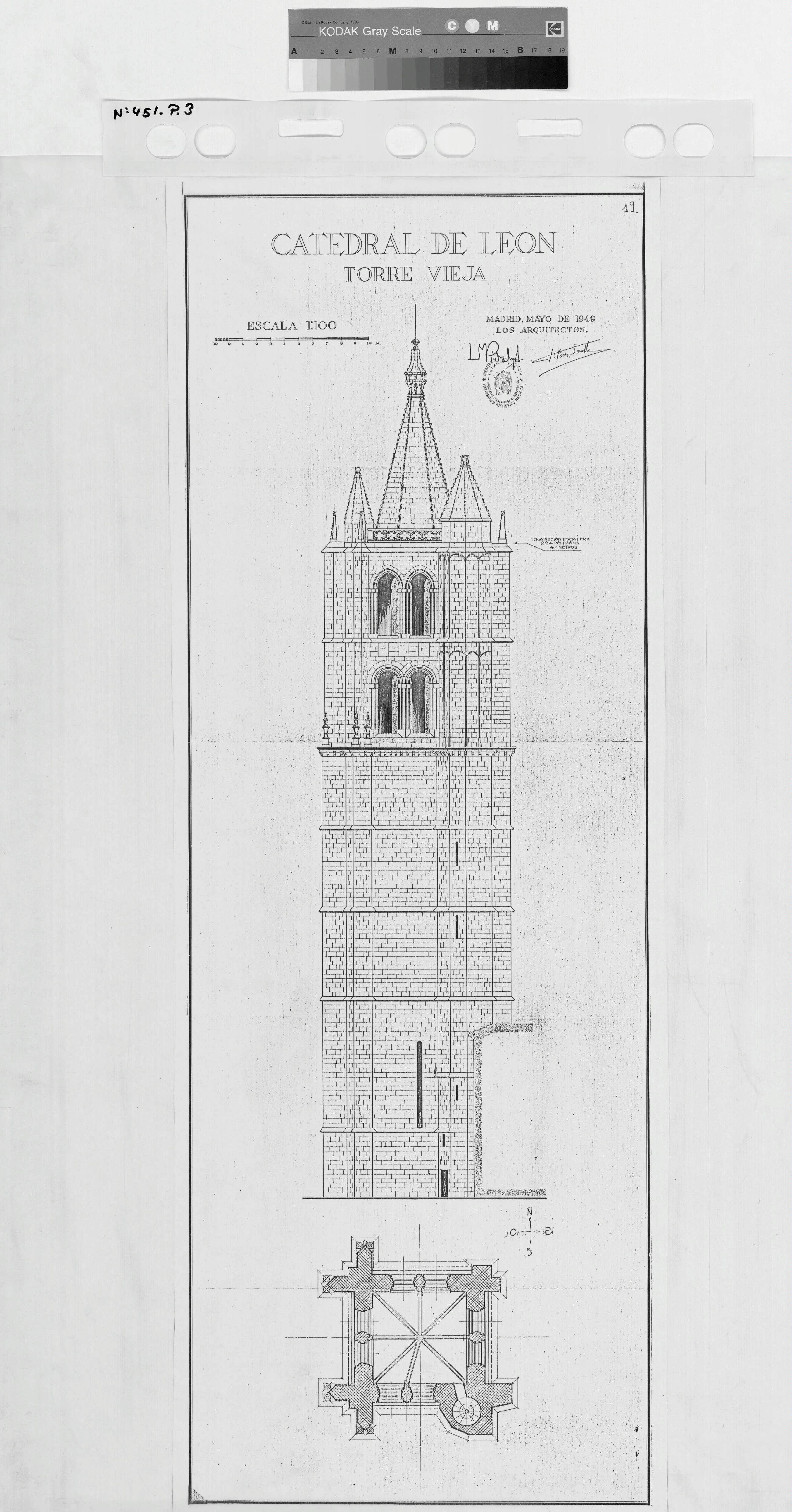 CATEDRAL DE LEON: TORRE VIEJA Planta y Alzado Sur La planta corresponde a uno de los últimos niveles y contiene proyección de bóveda. El alzado tiene dibujados los despieces de piedra y contiene una nota relativa a la altura, también tiene escala gráfica y está firmado.
