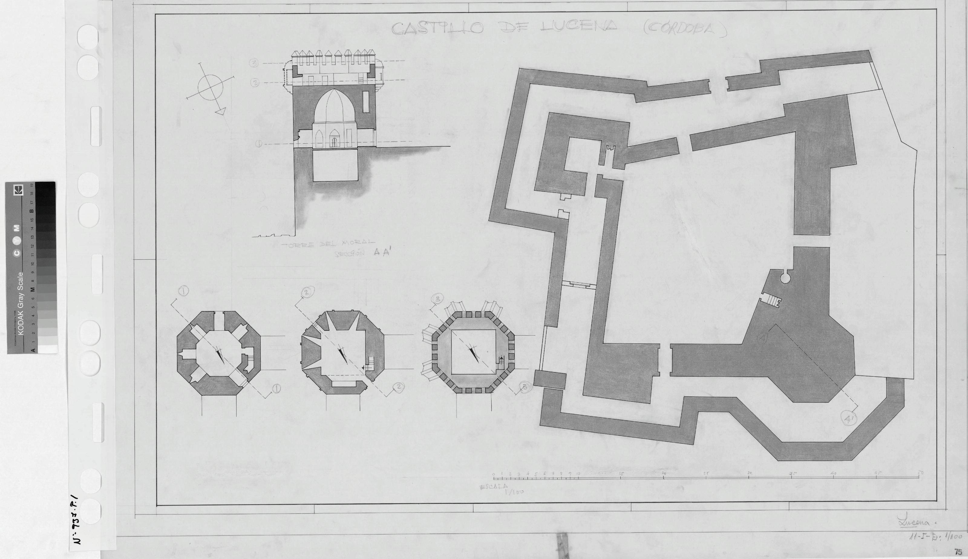 CASTILLO DE LUCENA . CORDOBA. -: PLANTA GENERAL DEL CASTILLO, ALZADO TORRE DEL MORAL, Y SECCION. junto con varias plantas de la torre .plano sin cotas.