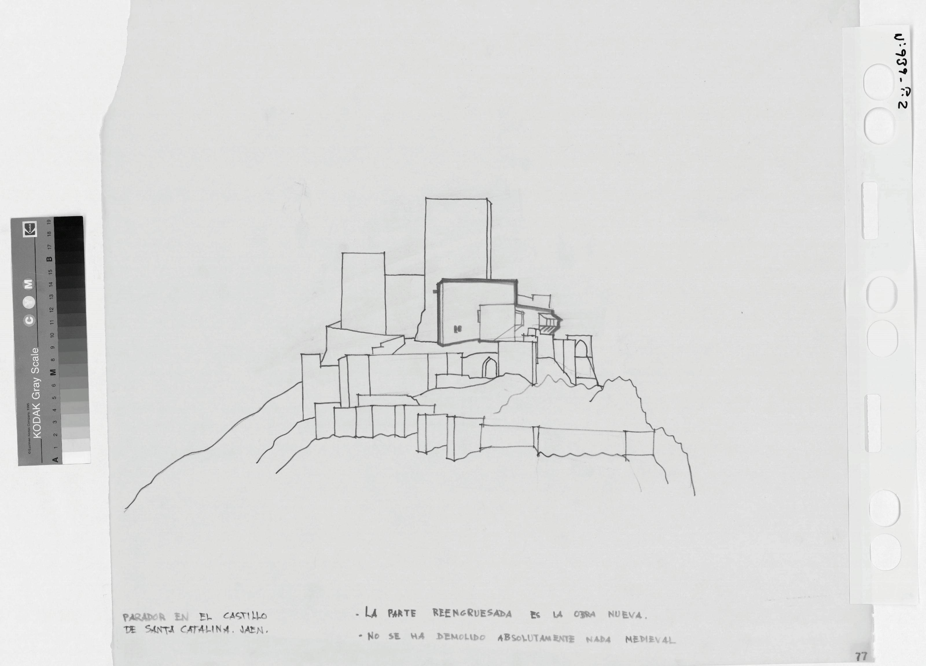 CASTILLO DE SANTA CATALINA . JAEN. -: ALZADO , Parador en el castillo de Santa Clara. Parte regruesada es la obra nueva del castillo. Plano croquizado, sin cotas.