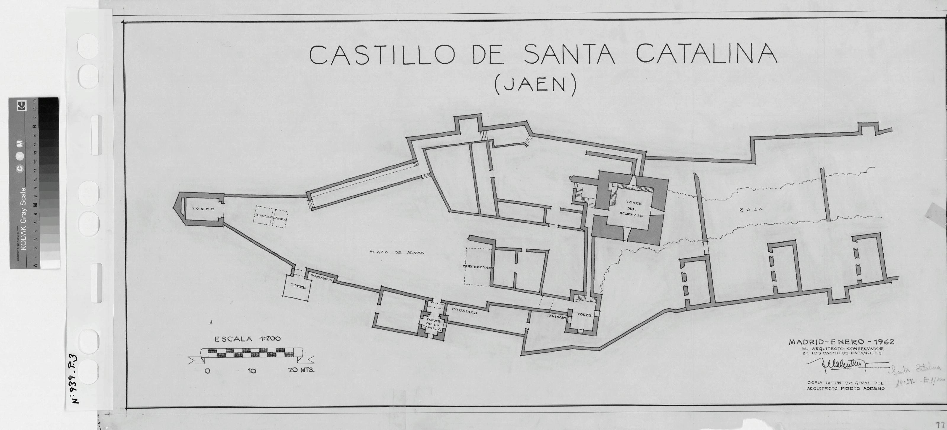 CASTILLO DE SANTA CATALINA . JAEN. -: PLANTA GENERAL. Según copia de un original del arquitecto Prieto Moreno, plano con muros regruesadoss y señala algunas zonas del recinto del castillo. Plano sin cotas.