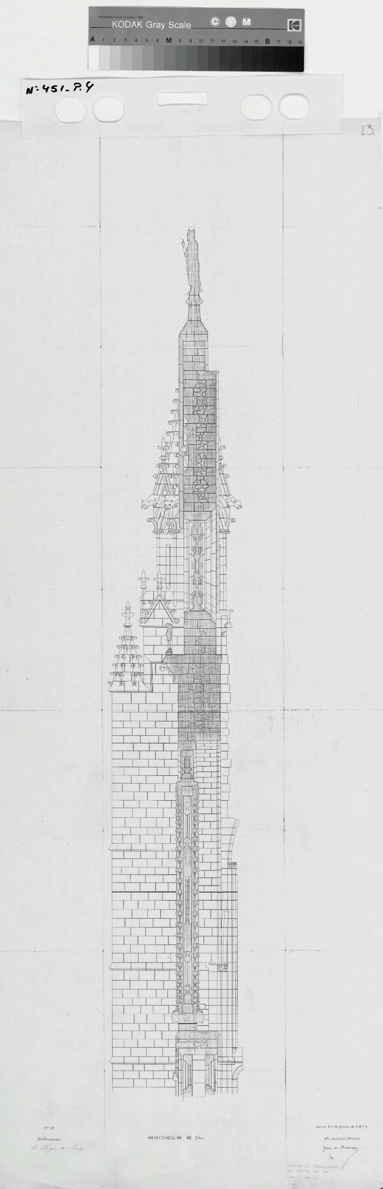 CATEDRAL DE LEON: SECCION VERTICAL - Pone en una nota a lápiz "Proyecto de terminación del hastial del sur" Detalle de coronación de dicho hastial a linea fina y con sombreado de sección y despieces en proyecciones. Pone que es escala 5/100 y está firmado por el arquitecto y por el Obispo de León.