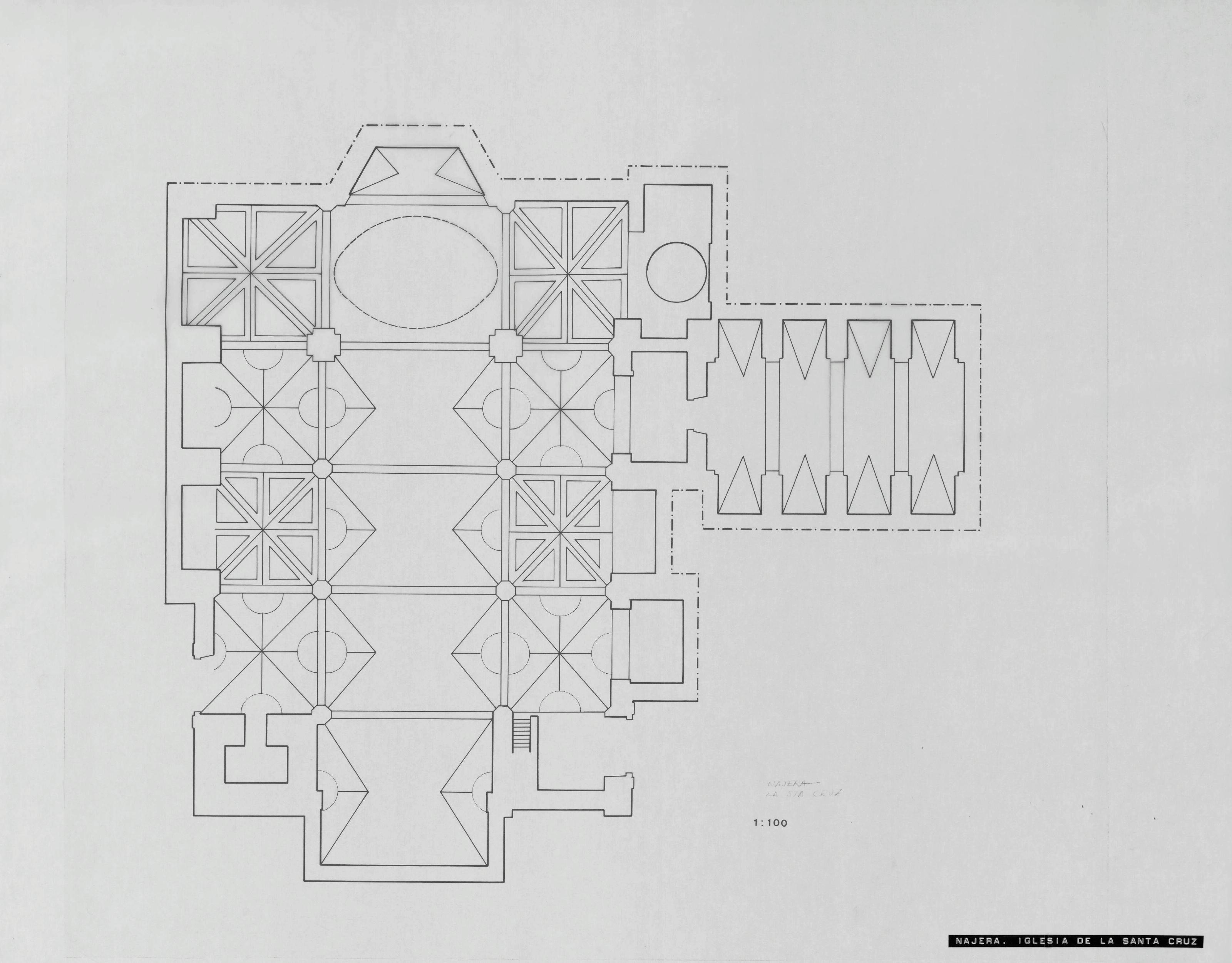 IGLESIA DE LA SANTA CRUZ: PLANTA GENERAL, plano de planta con proyeccion de bovedas y muros regruesados, sin cotas.