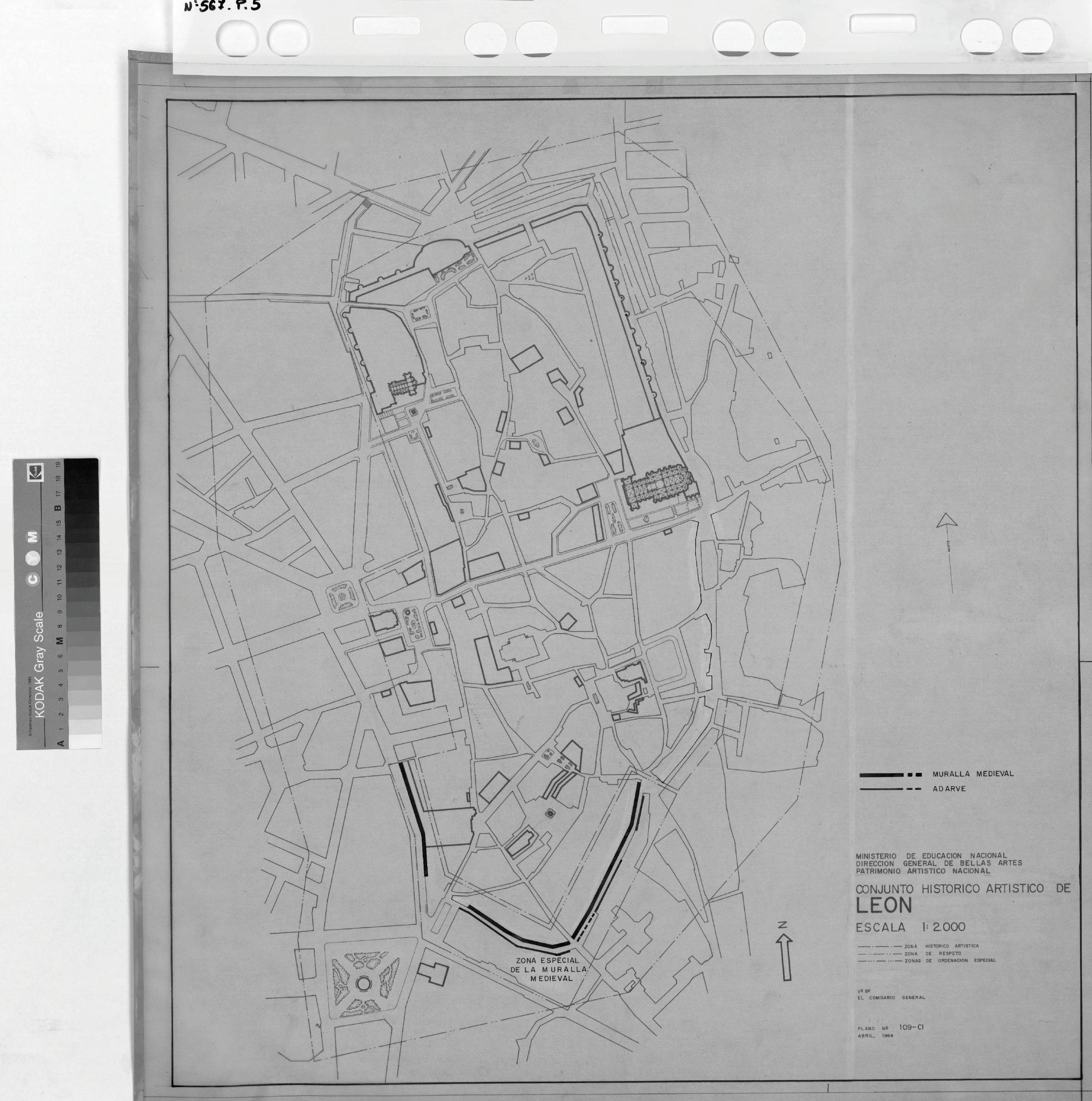 CONJUNTO HISTORICO ARTISTICO DE LEON (León): CONJUNTO HISTORICO ARTISTICO DE LEON Pone en sello: plano nº 109-CI Sobre copia del plano anterior marca la zona especial de la muralla medieval marcando también el adarve.