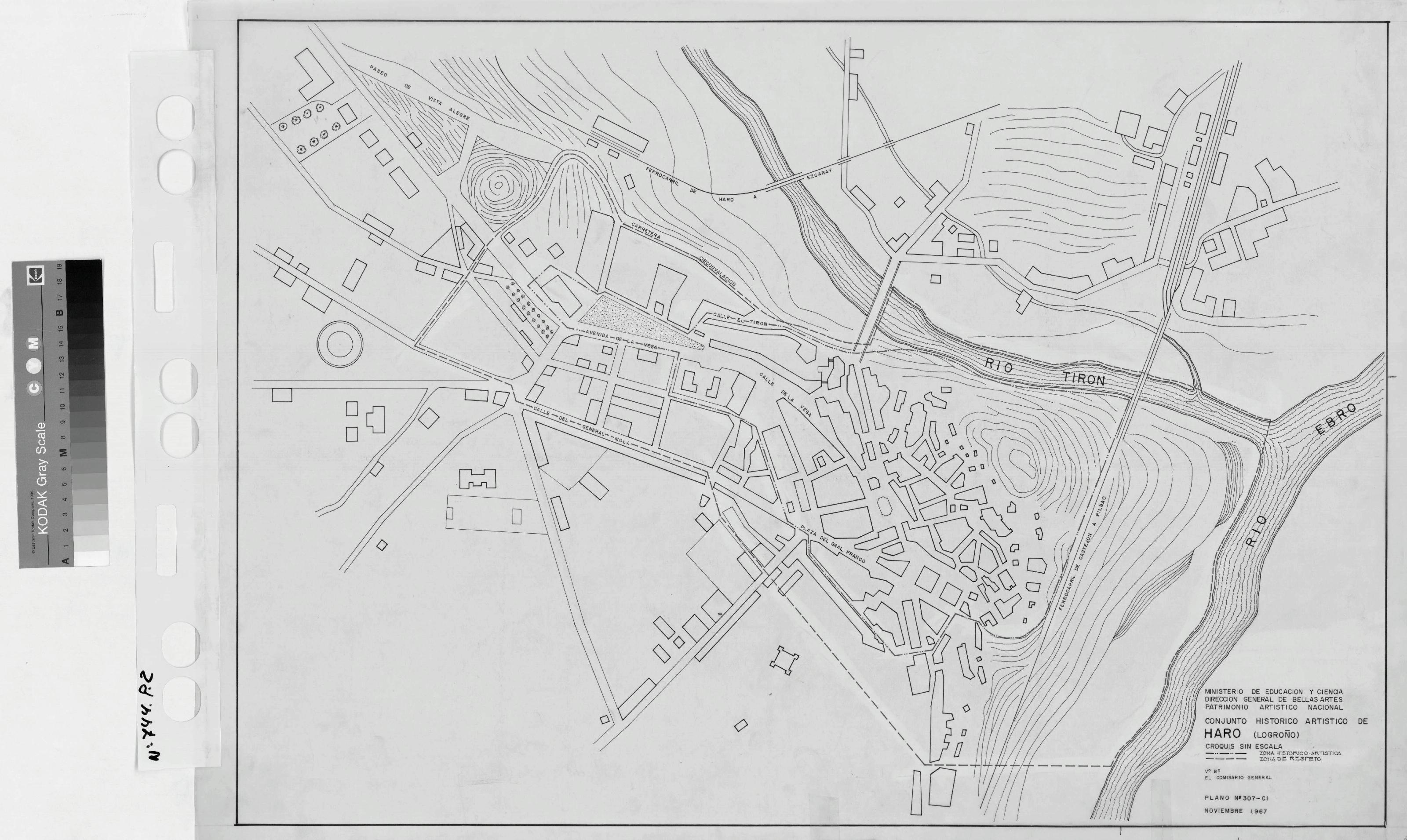 CONJUNTO HISTORICO ARTISTICO DE HARO: PLANO DE SITUACION, o emplazamiento del conjunto croquis sin escala, en este plano marca dos zonas a diferenciar: historico artistico del conjunto y de respeto, plano sin cotas.