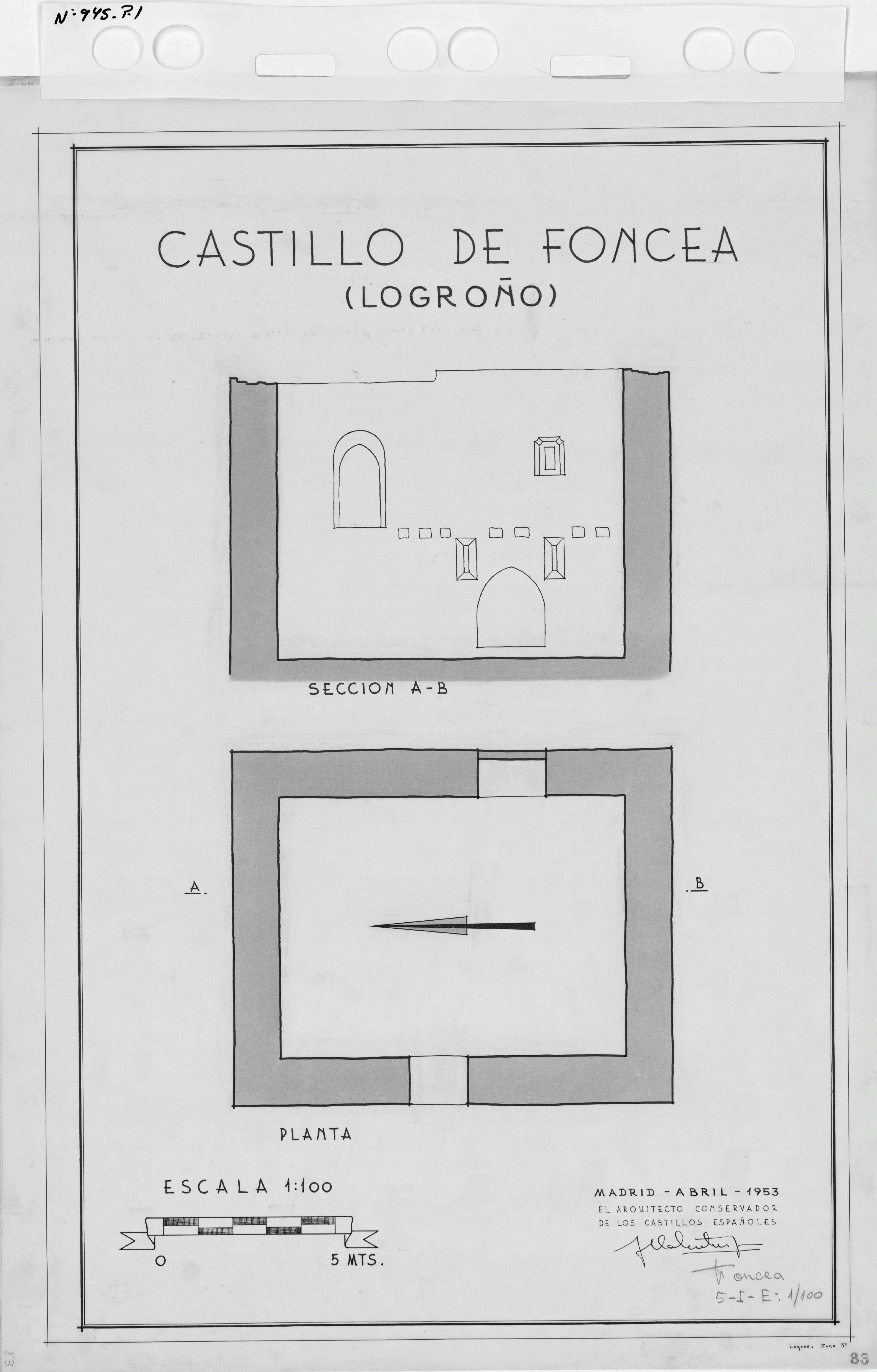 CASTILLO DE FONCEA - LOGROÑO-: PLANTA Y SECCION DEL CASTILLO, Plano con muros regruesados y sombreados, sin cotas.