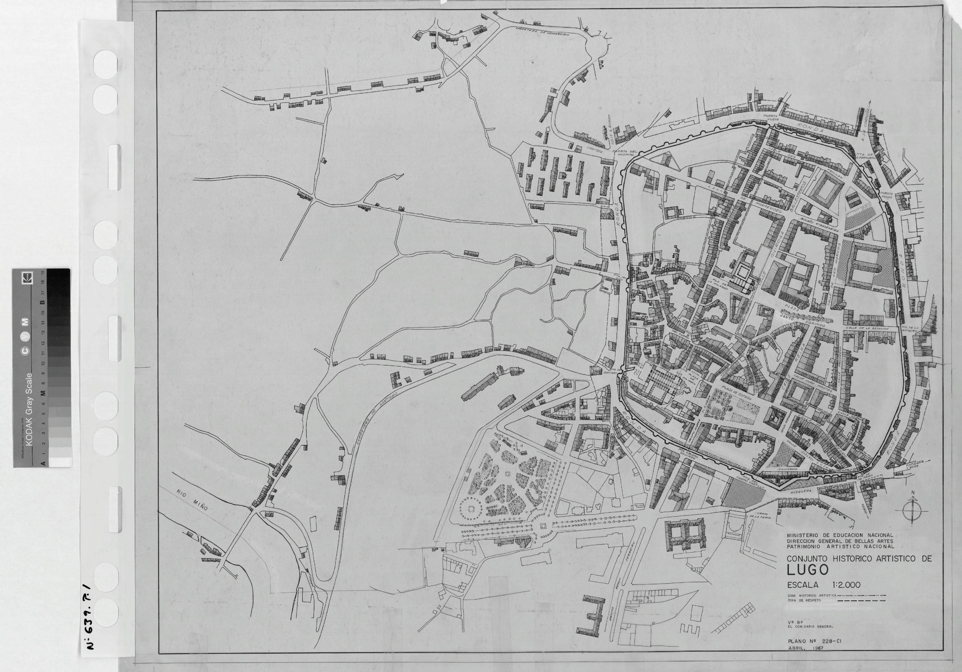 CONJUNTO HISTORICO ARTISTICO DE - LUGO -: PLANTA GENERAL DEL CONJUNTO HISTORICO ARTISTICO DE LUGO. Plano con dos zonas diferenciadas; una historica artistica y otra de respeto, con nomenclatura de calles, plano con detalle, sin cotas.