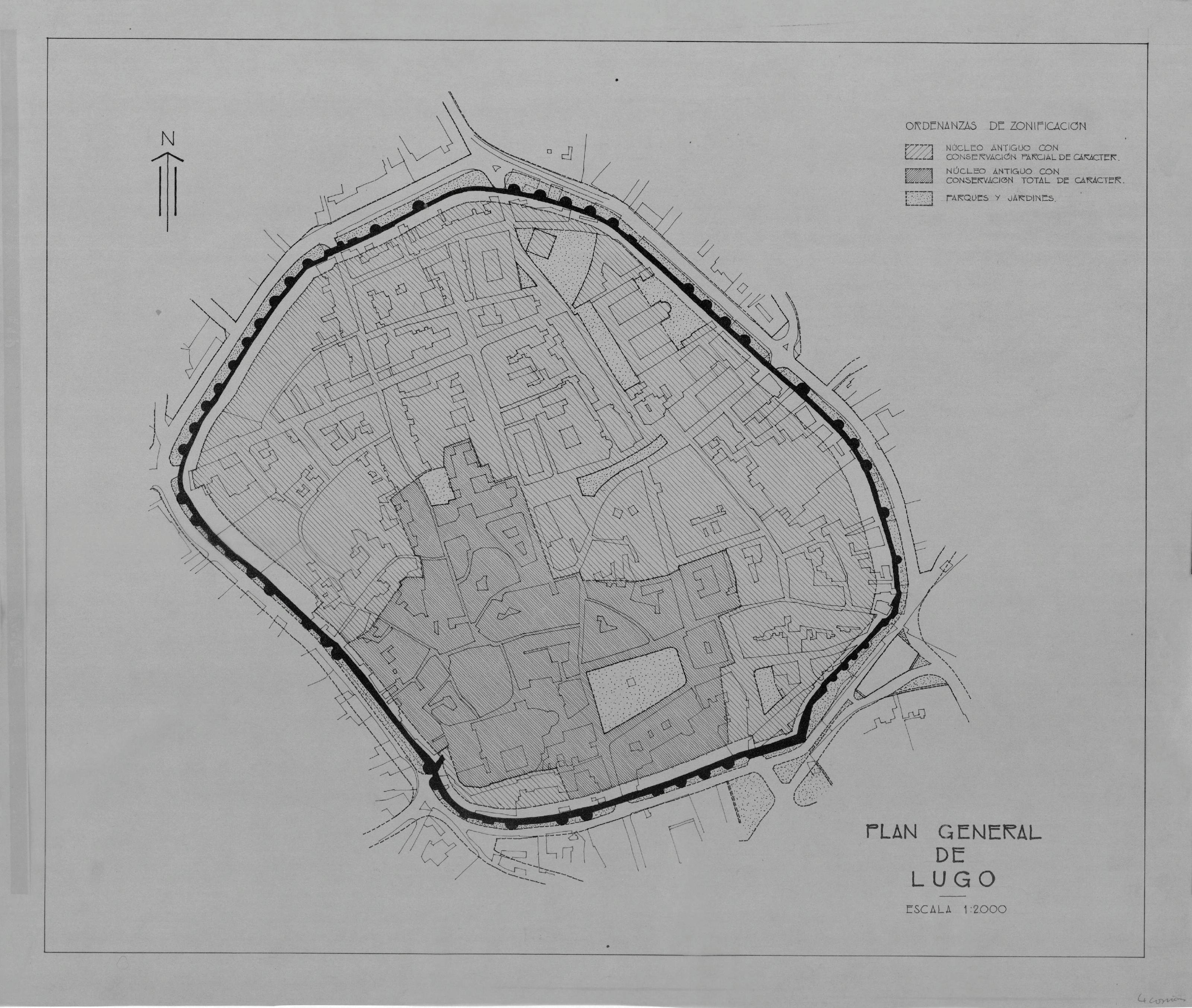 PLAN GENERAL DE LUGO: PLAN GENERAL DE LUGO. Plano con zonas diferenciadas; nucleo antiguo co conservacion parcial de carácter, nucleo antiguo con conservacion total de carácter, parques y jardines. plano sin cotas.