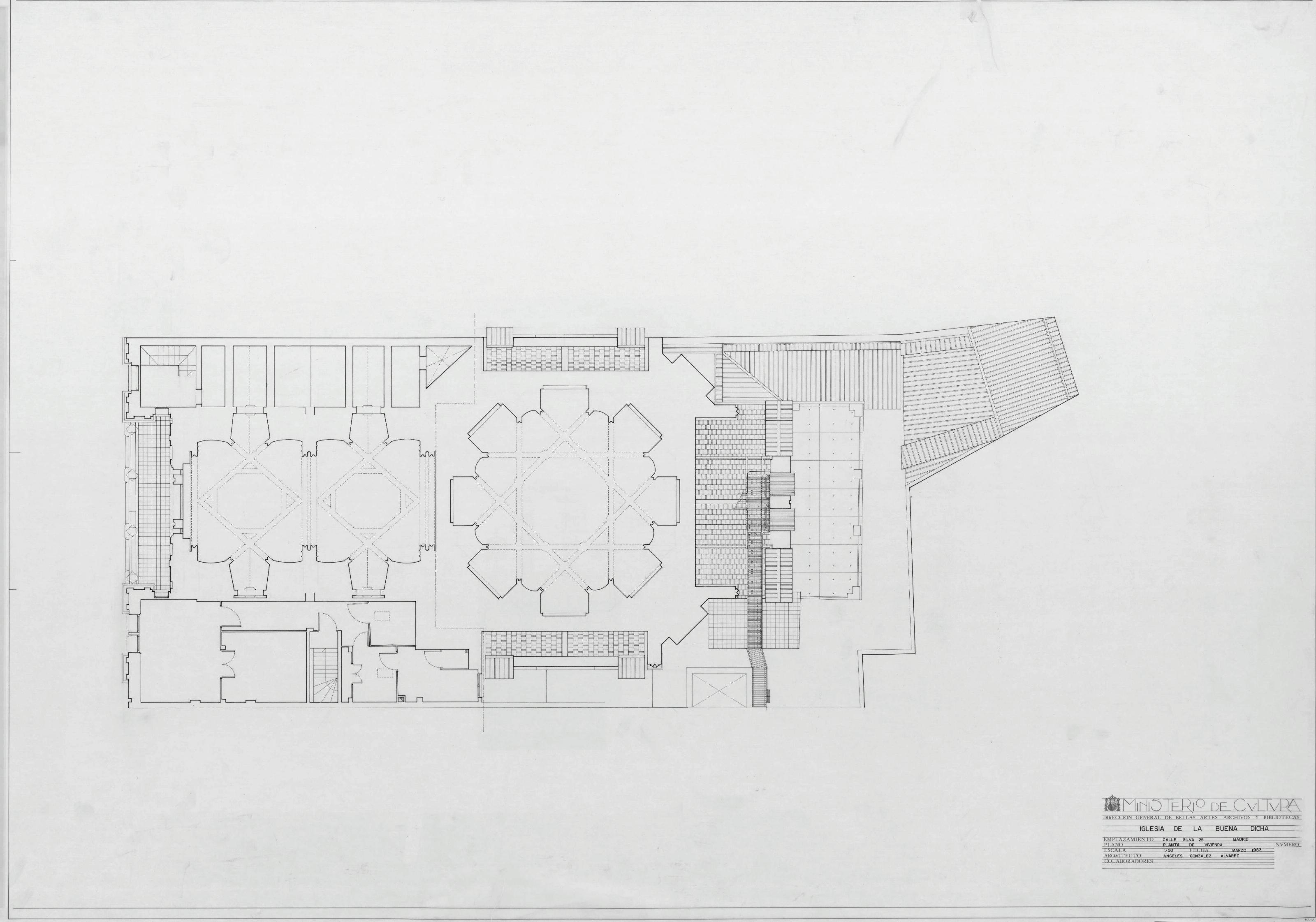 IGLESIA DE LA BUENA DICHA: PLANTA DE VIVIENDA. Plano de planta de la iglesia con muros regruesados , con emplazamiento a calle silva, plano sin cotas.