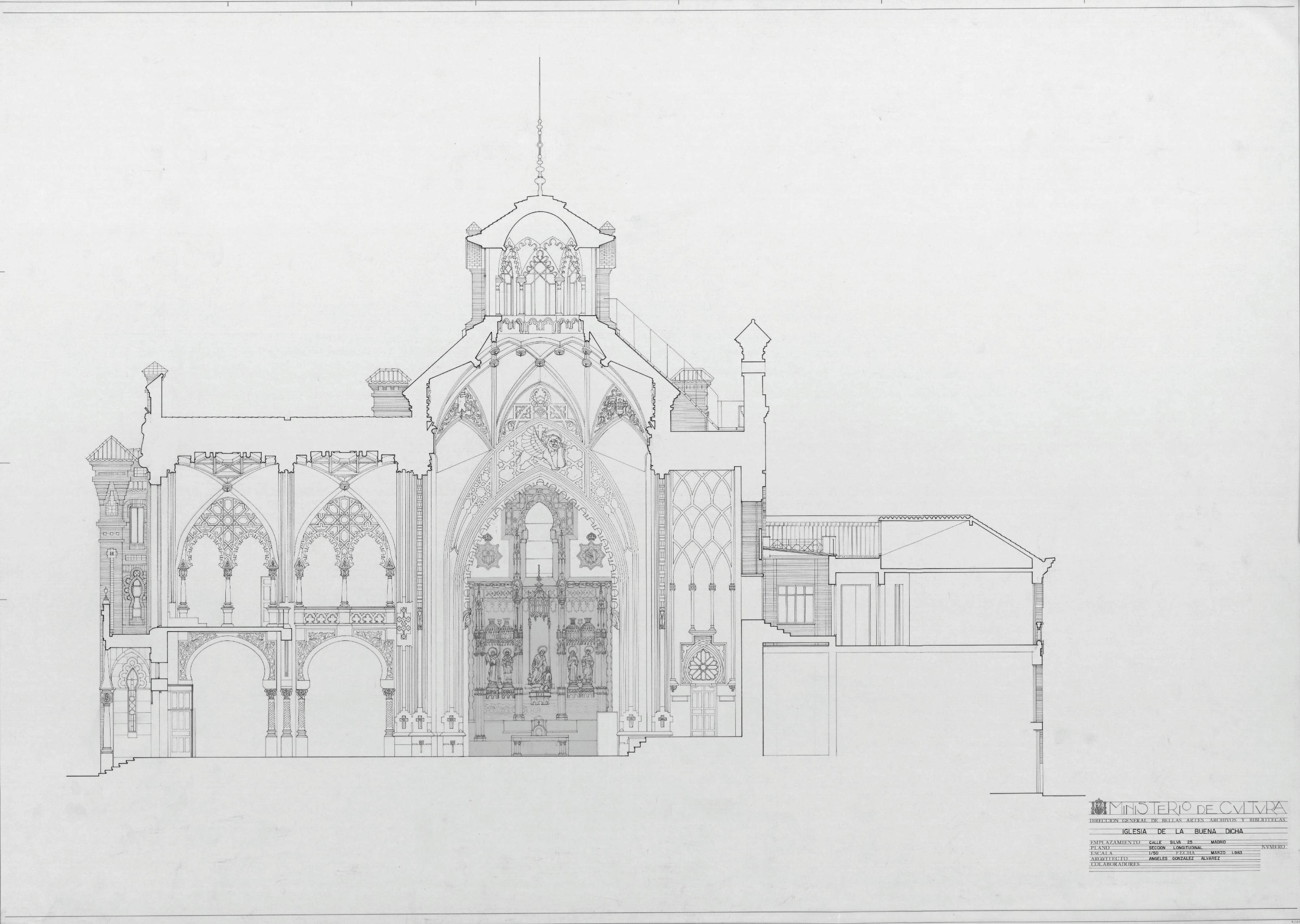 IGLESIA DE LA BUENA DICHA: SECCION LONGITUDINAL. Plano seccionado muy detallado con bovedas y retablo dibujado, emplazamiento a calle silva, plano sin cotas.