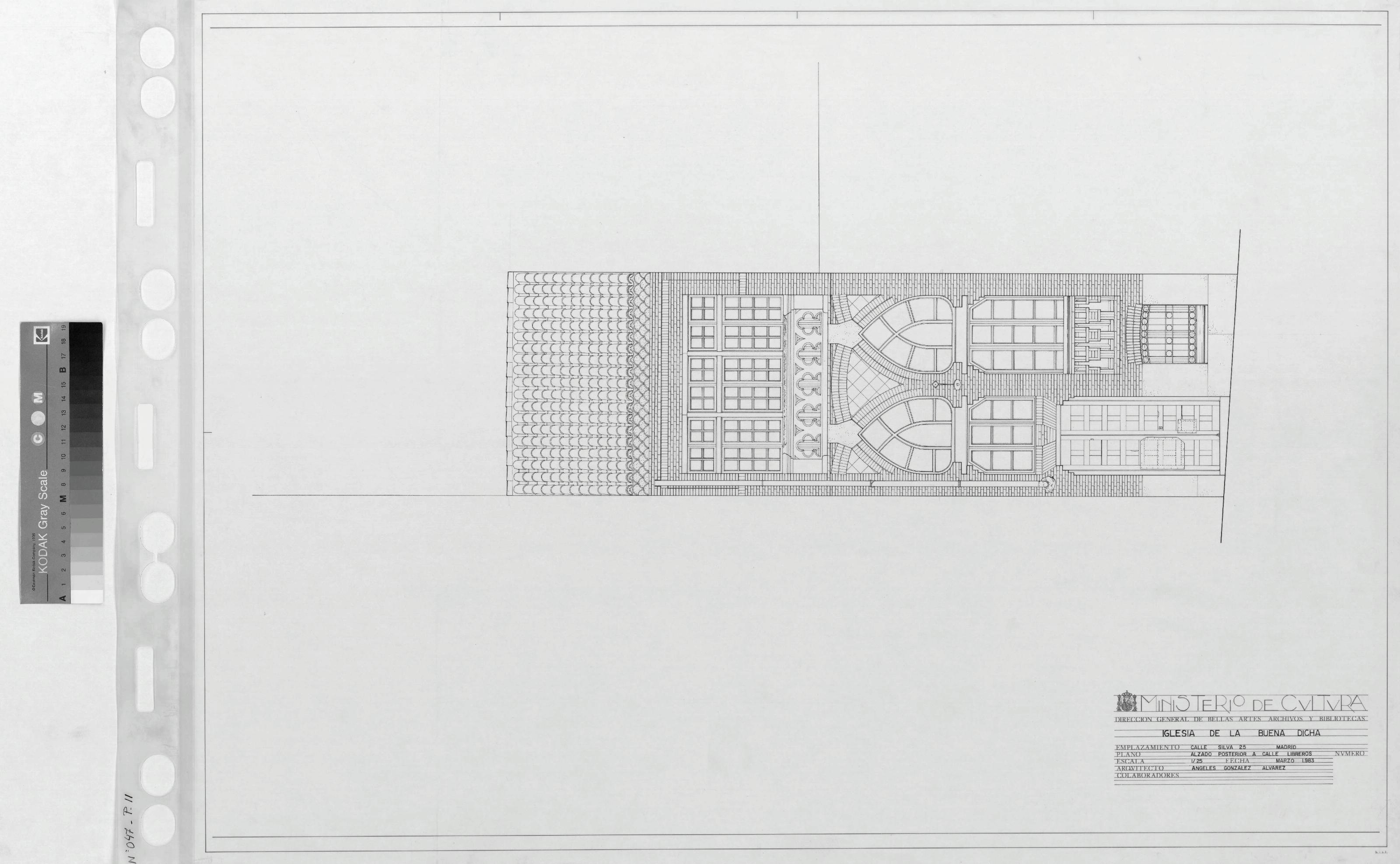 IGLESIA DE LA BUENA DICHA: ALZADO POSTERIOR A LA CALLE LIBREROS. Alzado dibujado con mucho detalle, emplazamiento a calle silva, plano sin cotas.