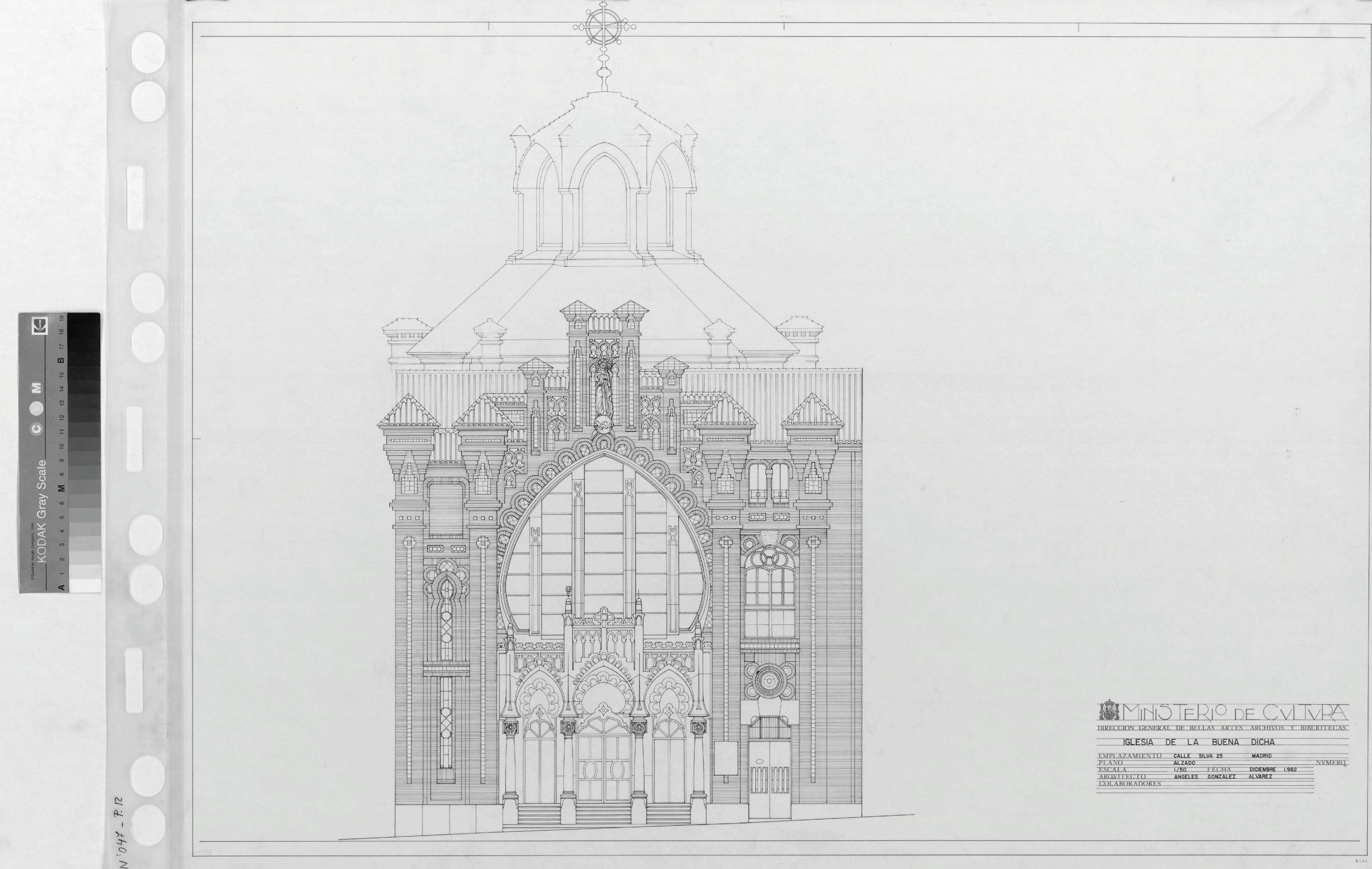 IGLESIA DE LA BUENA DICHA: ALZADO . Alzado dibujado con mucho detalle, emplazamiento a calle silva, plano sin cotas.