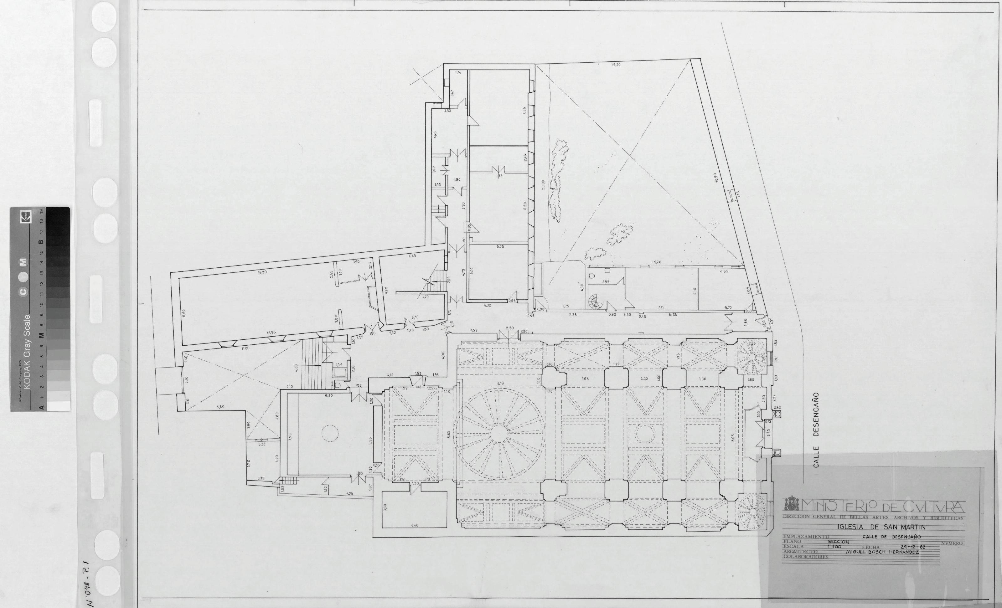 IGLESIA DE SAN MARTIN.: PLANTA GENERAL DE LA IGLESIA . Planta general con proyeccion de bovedas, con emplazamiento a calle desengaño, plano con cotas.