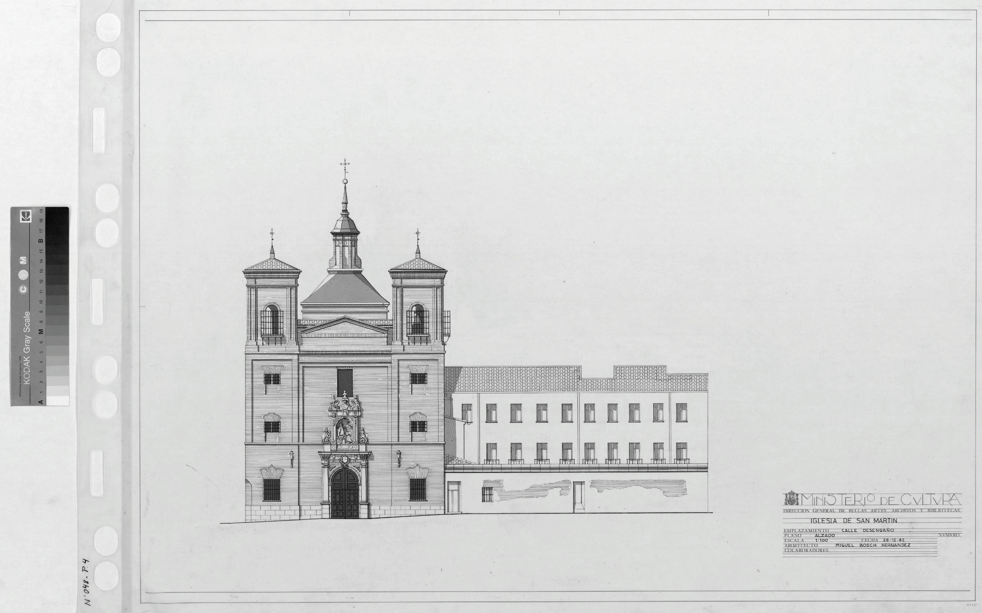 IGLESIA DE SAN MARTIN.: ALZADO PRINCIPAL. Plano dibujado con detalle , con emplazamiento a calle desengaño, plano con cotas.