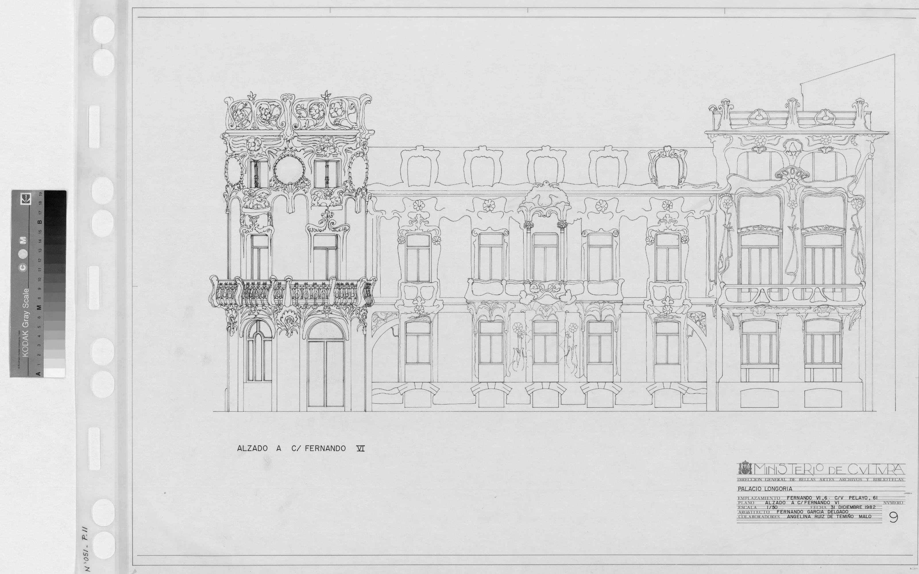 PALACIO DE LONGORIA: ALZADO A C/FERNANDO VI . Alzado , plano dibujado con detalle, con emplazamiento a calle Fernando VI , plano sin cotas.