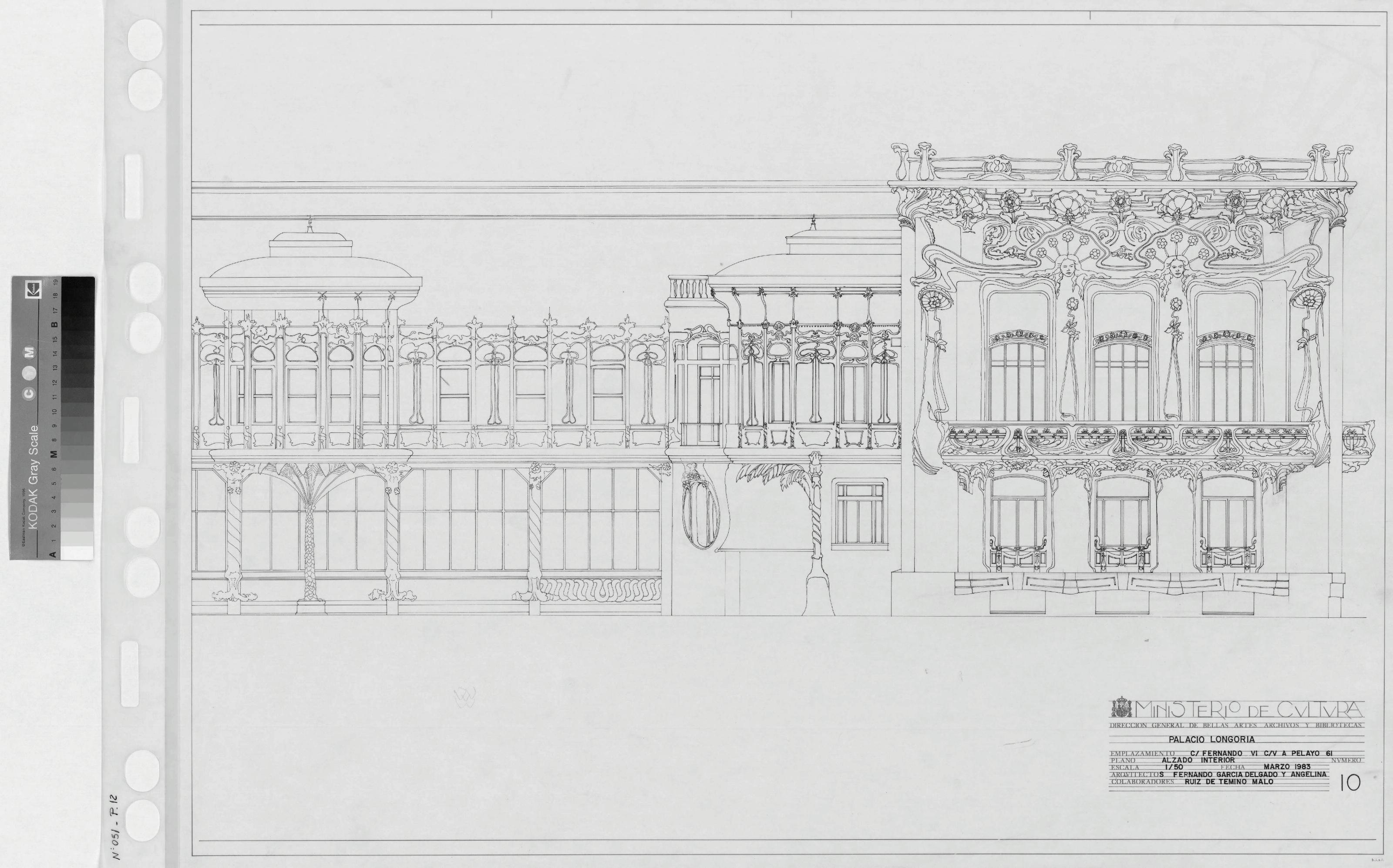 PALACIO DE LONGORIA: ALZADO INTERIOR . Alzado , plano dibujado con detalle, con emplazamiento a calle Fernando VI y calle Pelayo , plano sin cotas.