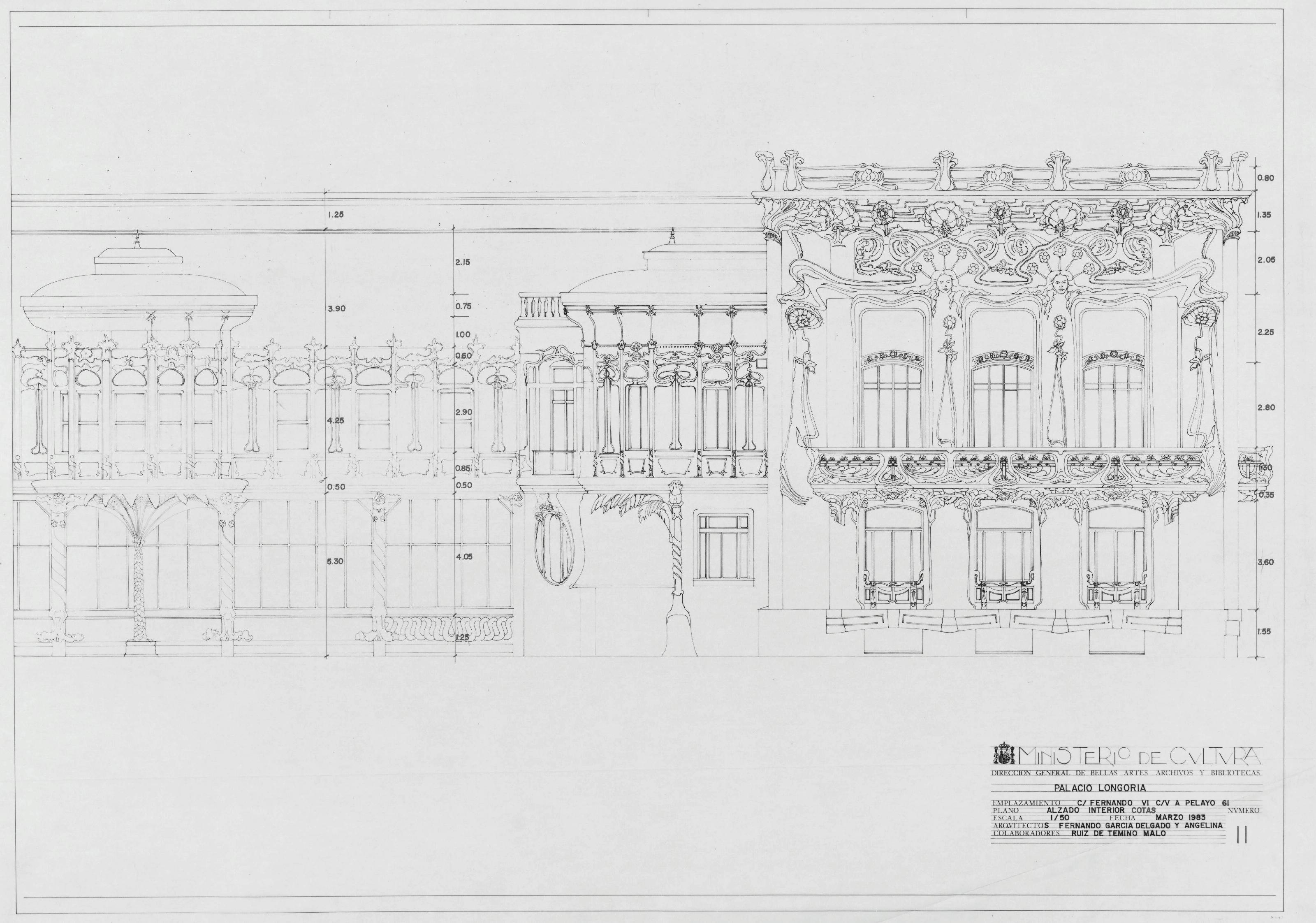 PALACIO DE LONGORIA: ALZADO INTERIOR COTAS . Alzado , plano dibujado con detalle , emplazamiento a calle Fernando VI y calle Pelayo , plano con cotas.
