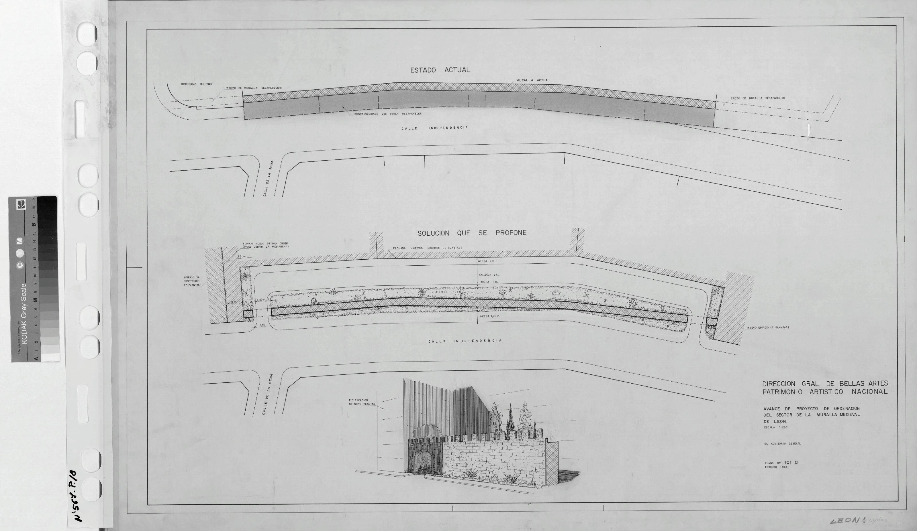 CONJUNTO HISTORICO ARTISTICO DE LEON (León): AVANCE DEL PROYECTO DE ORDENACIÓN DEL SECTOR DE LA MURALLA MEDIEVAL. Con planta estado actual y planta con la solución que se propone. Con cotas y notas. Contiene también pequeña perspectiva tratada con sombras de una parte del conjunto. Pone en sello plano nº 101 CI
