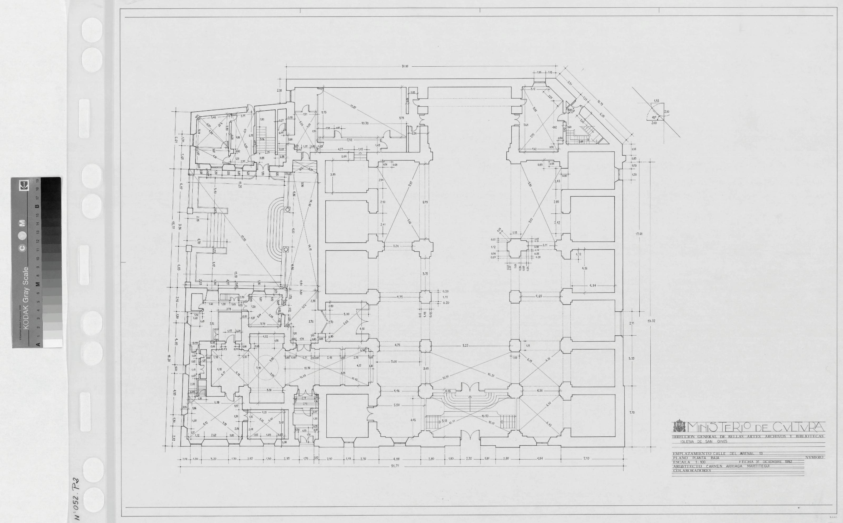 IGLESIA DE SAN GINES: PLANTA BAJA COTAS , plano dibujado , con muros regruesados, emplazamiento a calle Arenal , plano con cotas.