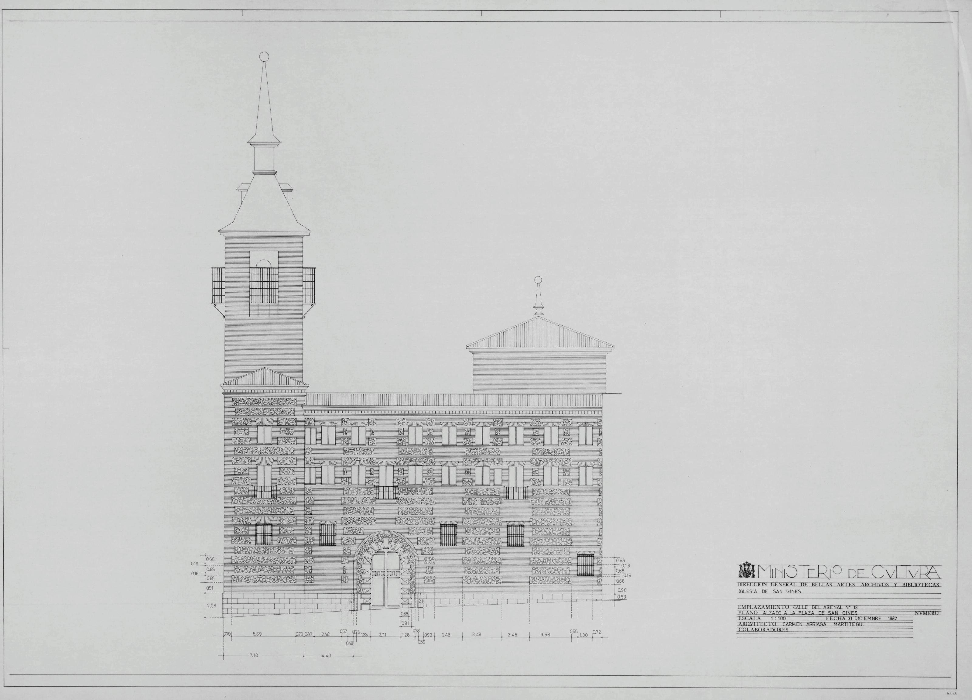 IGLESIA DE SAN GINES: ALZADO A PLAZA DE SAN GINES, COTAS , plano dibujado con detalle , emplazamiento a calle Arenal , plano con cotas.
