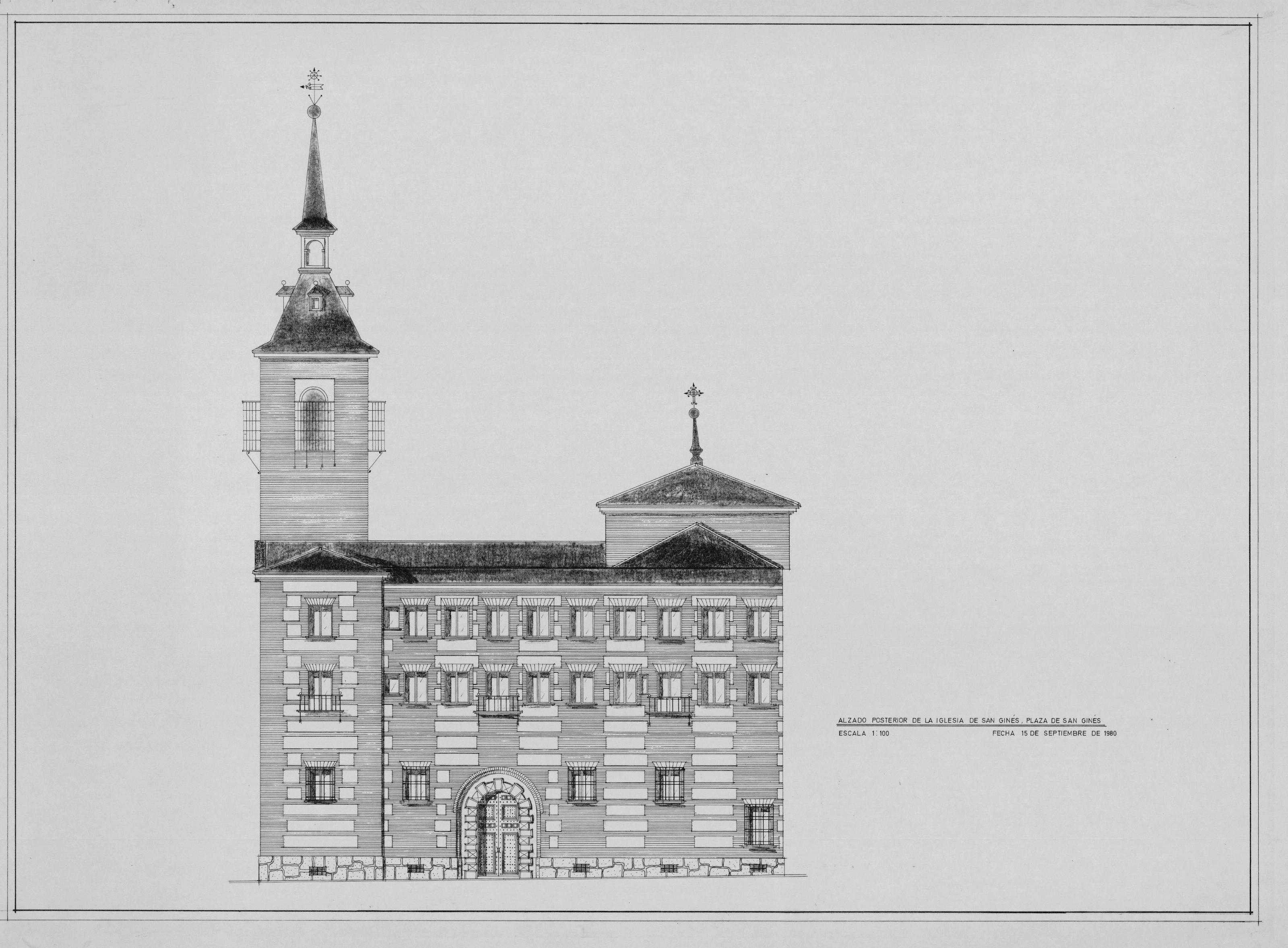 IGLESIA DE SAN GINES: ALZADO POSTERIOR, de la iglesia, plano dibujado con detalle , emplazamiento a plaza de San Gines, plano sin cotas.