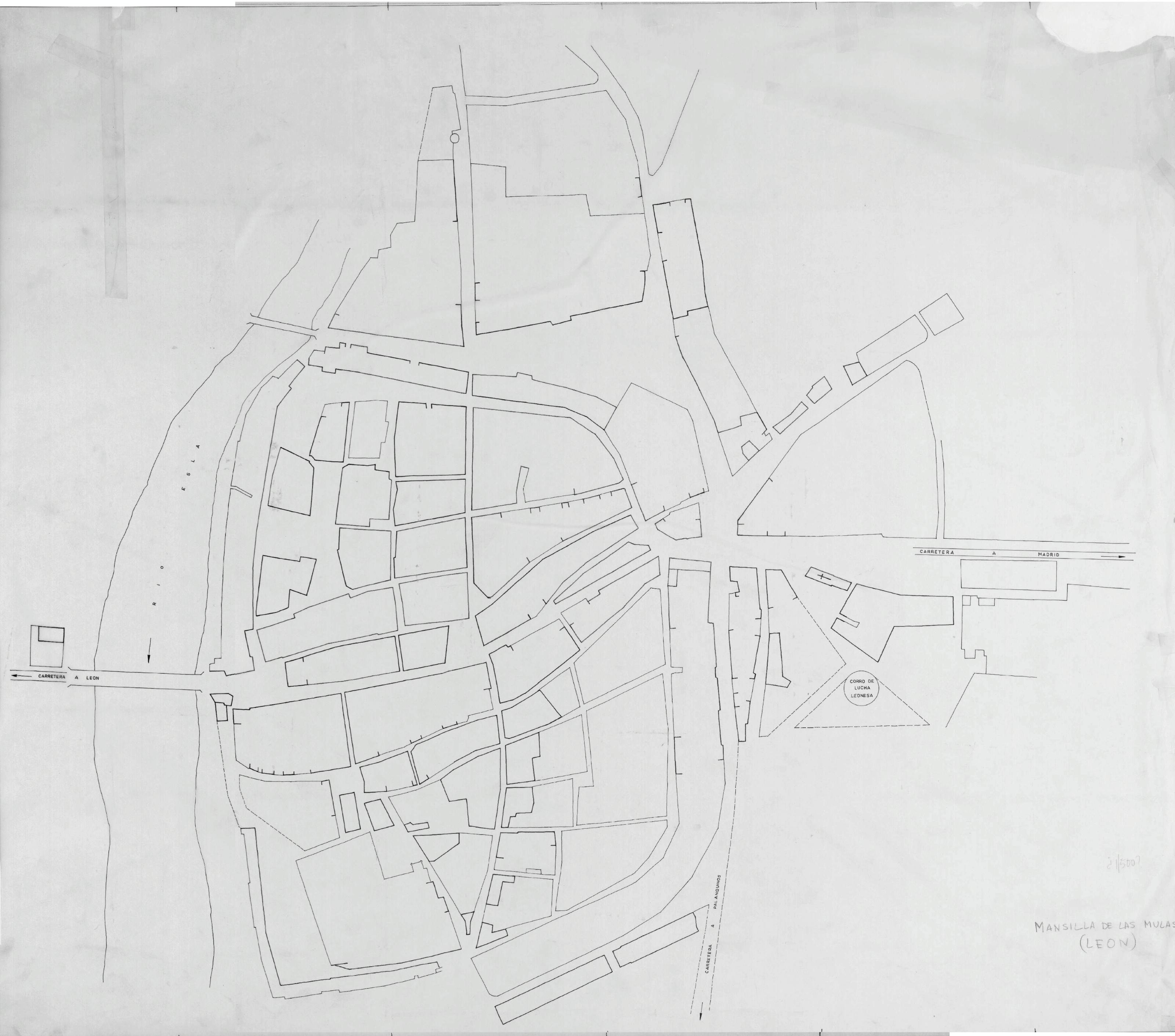 CONJUNTO HISTORICO ARTISTICO DE MANSILLA DE LAS MULAS (León): PLANO GENERAL DEL ENTORNO Menciona algunos accesos a la población y se vé la estructura urbanística simple sin nombre de calles