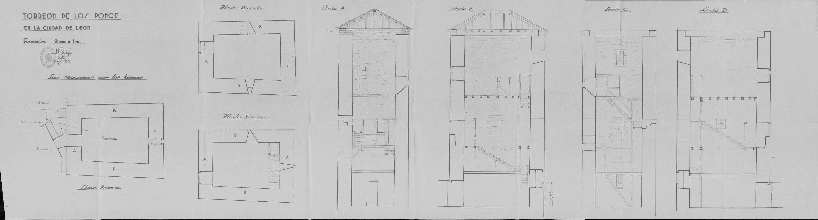 Torreón de los Ponce. León.: Plantas primera, segunda y tercera y alzados interiores del Torreón.