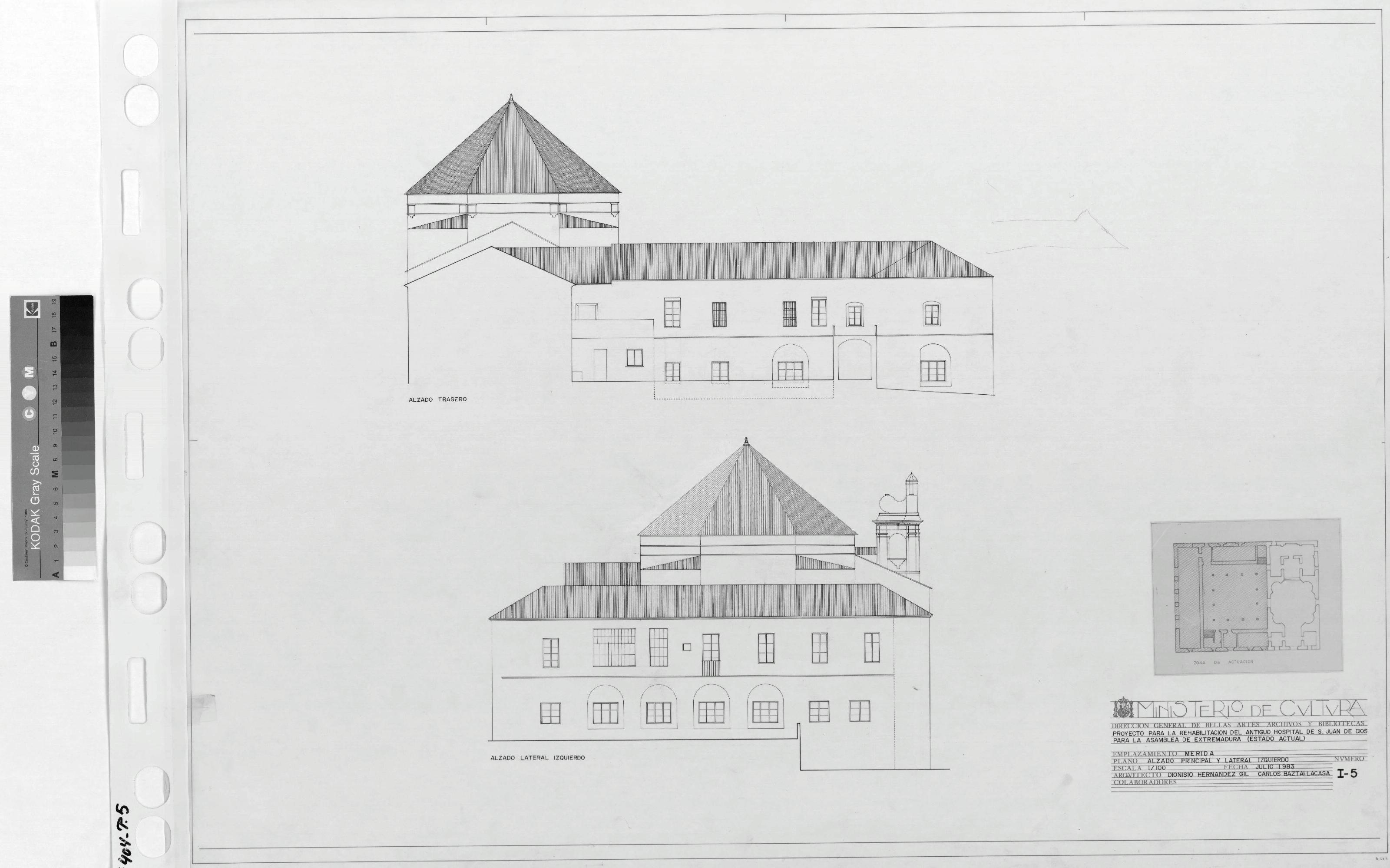 ASAMBLEA DE EXTREMADURA PROYECTO DE REHABILITACIÓN DEL ANTIGUO HOSPITAL DE S. JUAN DE DIOS PARA SEDE DE LA ASAMBLEA: ALZADO TRASERO Y LATERAL IZQDO. Sin notas ni cotas Con dibujo a pequeña escala determinando zona de actuación Sin firmar