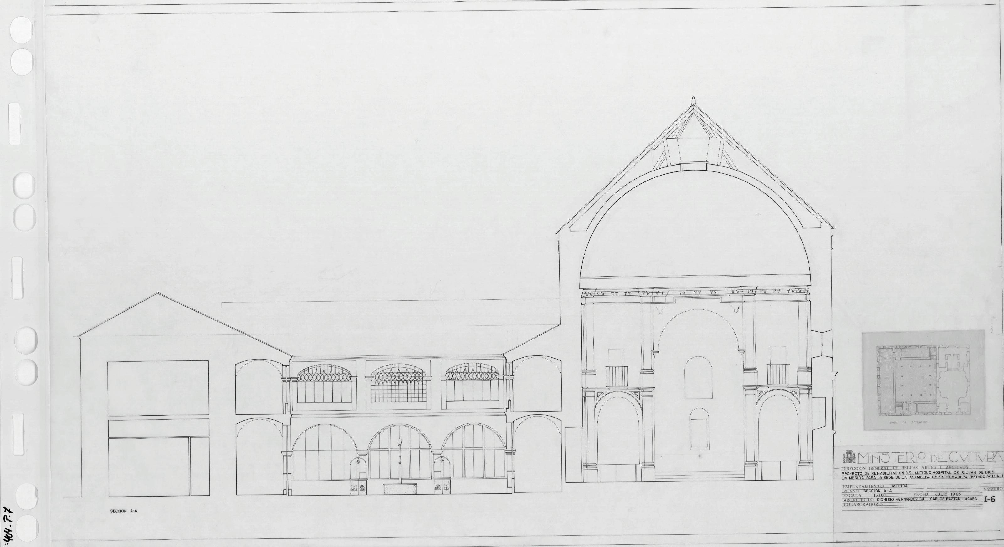 ASAMBLEA DE EXTREMADURA PROYECTO DE REHABILITACIÓN DEL ANTIGUO HOSPITAL DE S. JUAN DE DIOS PARA SEDE DE LA ASAMBLEA: SECCION A-A Bastante detallado. Sin notas ni cotas Con dibujo a pequeña escala determinando zona de actuación Sin firmar