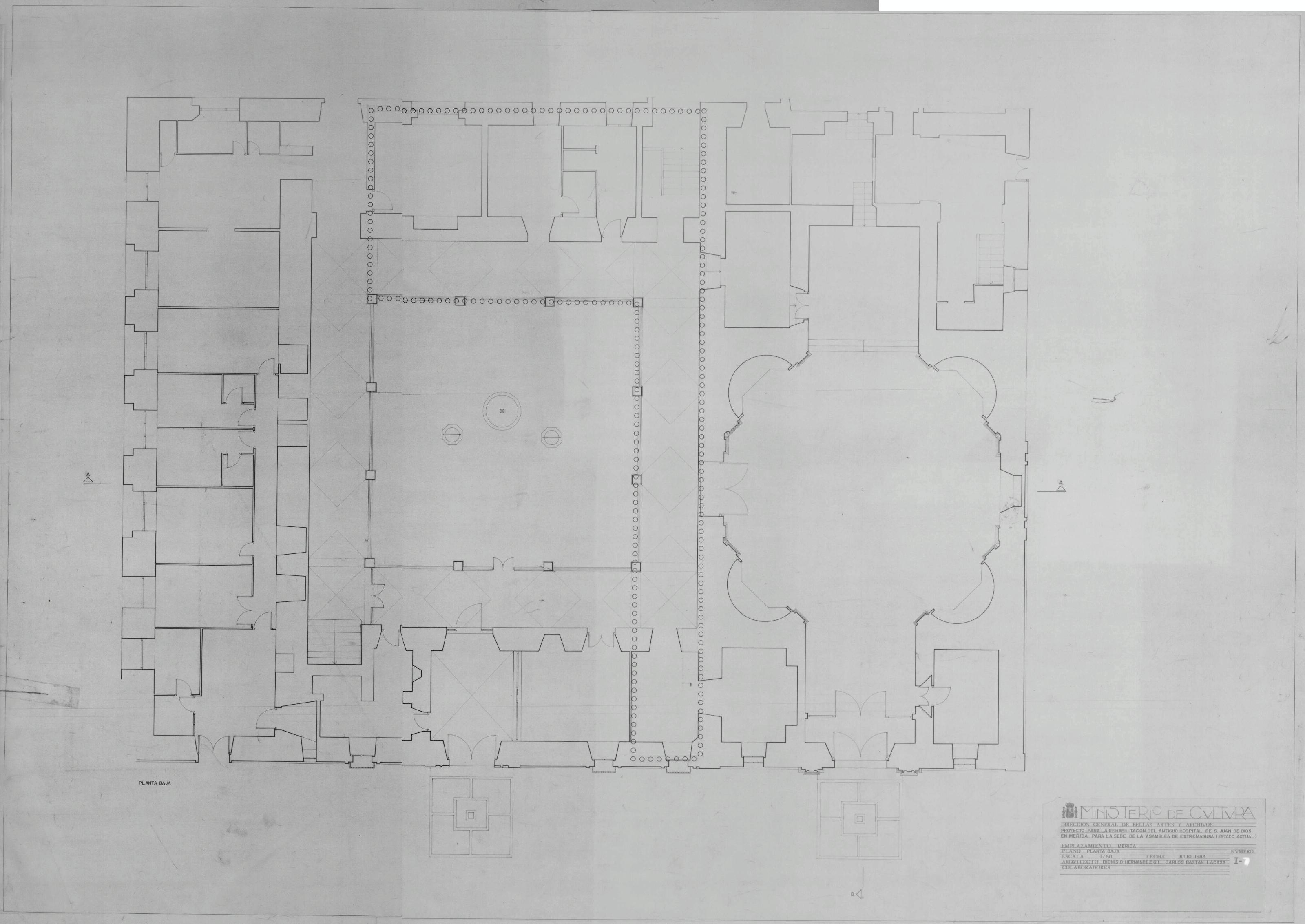 ASAMBLEA DE EXTREMADURA PROYECTO DE REHABILITACIÓN DEL ANTIGUO HOSPITAL DE S. JUAN DE DIOS PARA SEDE DE LA ASAMBLEA: PLANTA BAJA Distribución. Sin notas ni cotas Con Líneas de sección A-A y B Marcada una zona en el centro delimitada con pequeños círculos Sin firmar