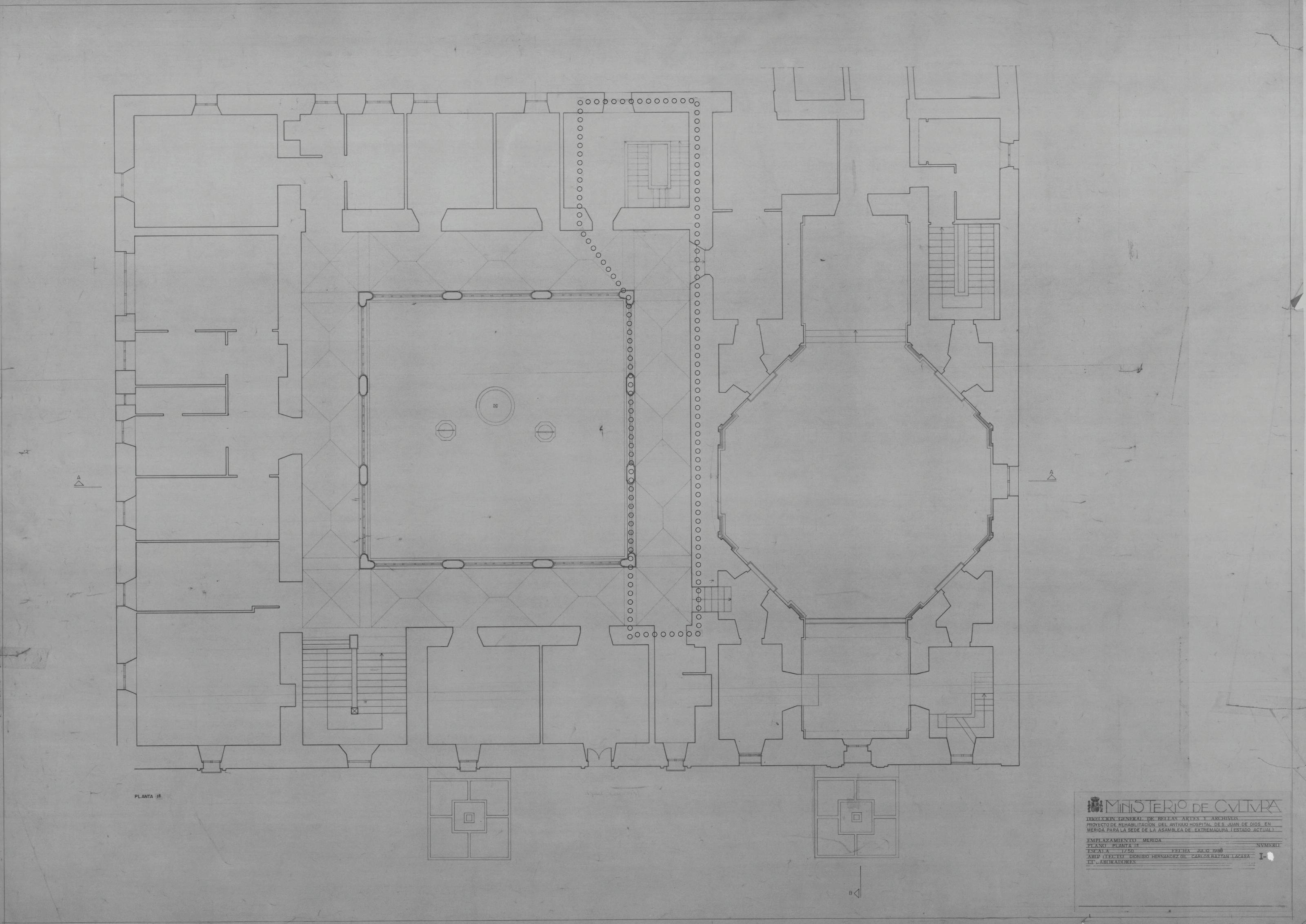ASAMBLEA DE EXTREMADURA PROYECTO DE REHABILITACIÓN DEL ANTIGUO HOSPITAL DE S. JUAN DE DIOS PARA SEDE DE LA ASAMBLEA: PLANTA PRIMERA Figura en sello "Estado Actual" Distribución. Sin notas ni cotas Con Línea de sección A-A Marcada una zona en el centro delimitada con pequeños círculos Sin firmar