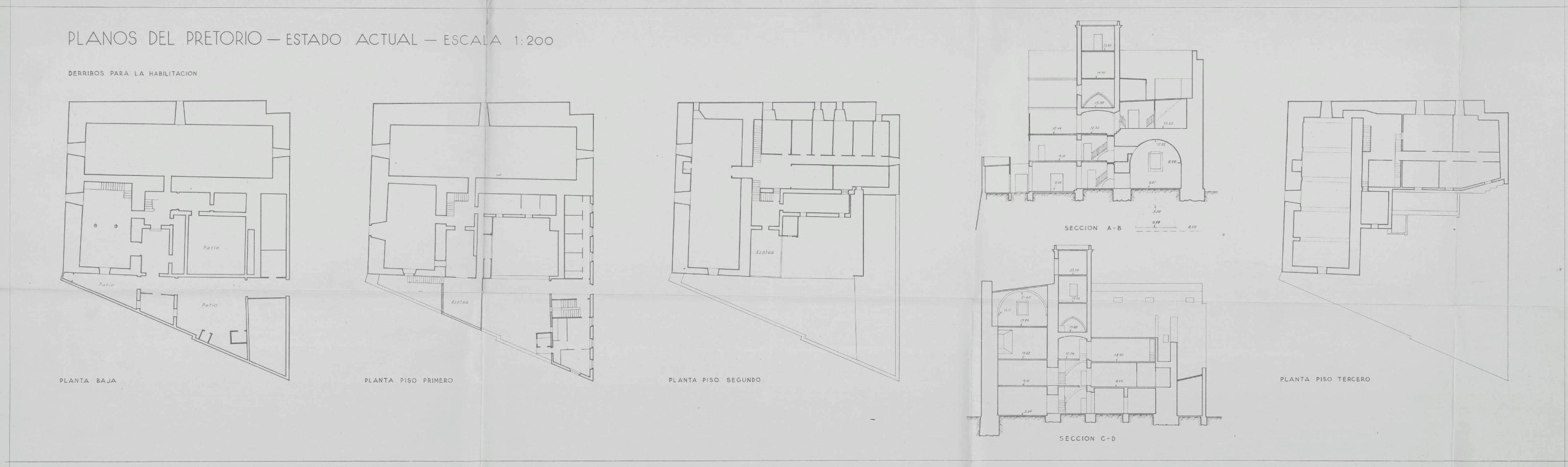 PROYECTO EN EL PRETORIO O PALACIO DE PILATOS DE TARRAGONA: PLANOS DEL PRETORIO-ESTADO ACTUAL-(PLANTAS BAJA, PRIMERA,SEGUNDA, TERCERA, Y SECCIONES A-B, C-D)