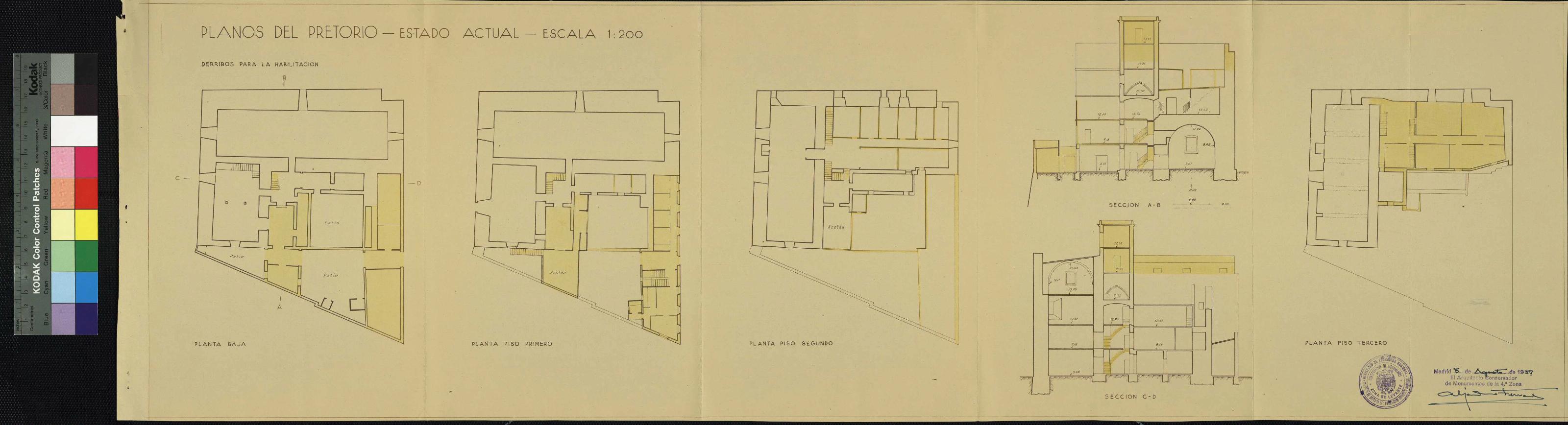 PROYECTO EN EL PRETORIO O PALACIO DE PILATOS DE TARRAGONA: PLANOS DEL PRETORIO-ESTADO ACTUAL-(PLANTAS BAJA, PRIMERA,SEGUNDA, TERCERA, Y SECCIONES A-B, C-D) DERRIBOS PARA LA HABILITACION