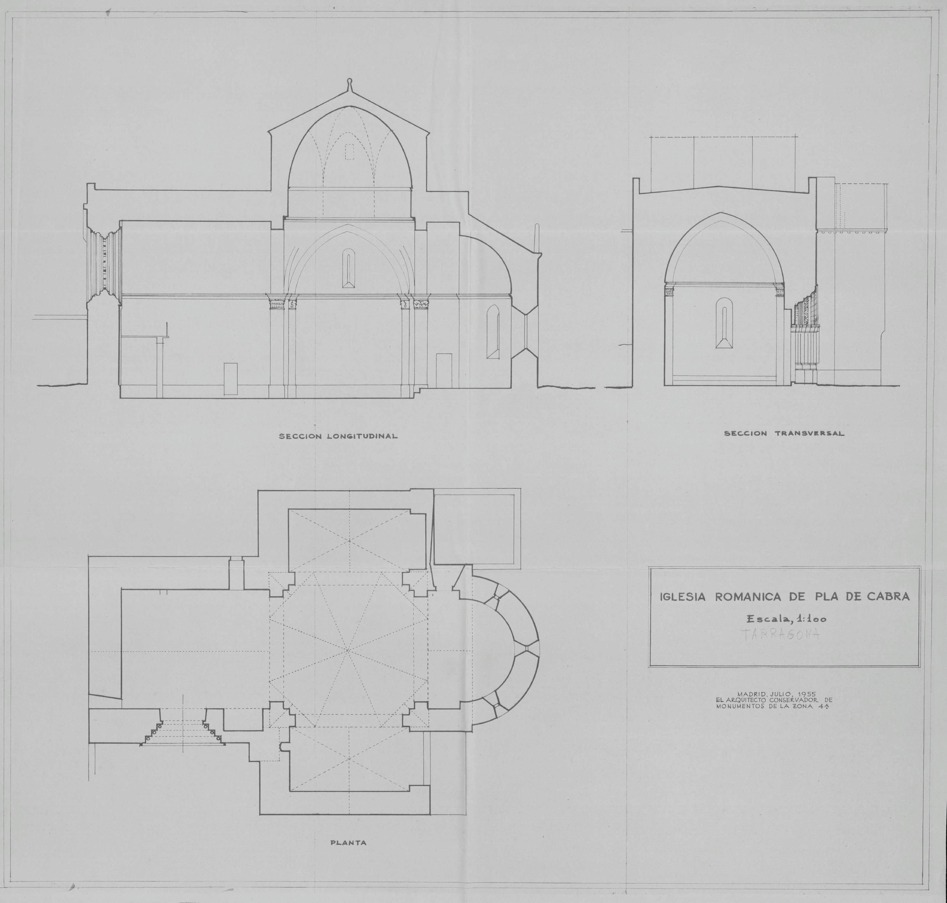 IGLESIA ROMANICA DE SAN RAMON: PLANTA, SECCION LONGITUDINAL Y SECCION TRANSVERSAL