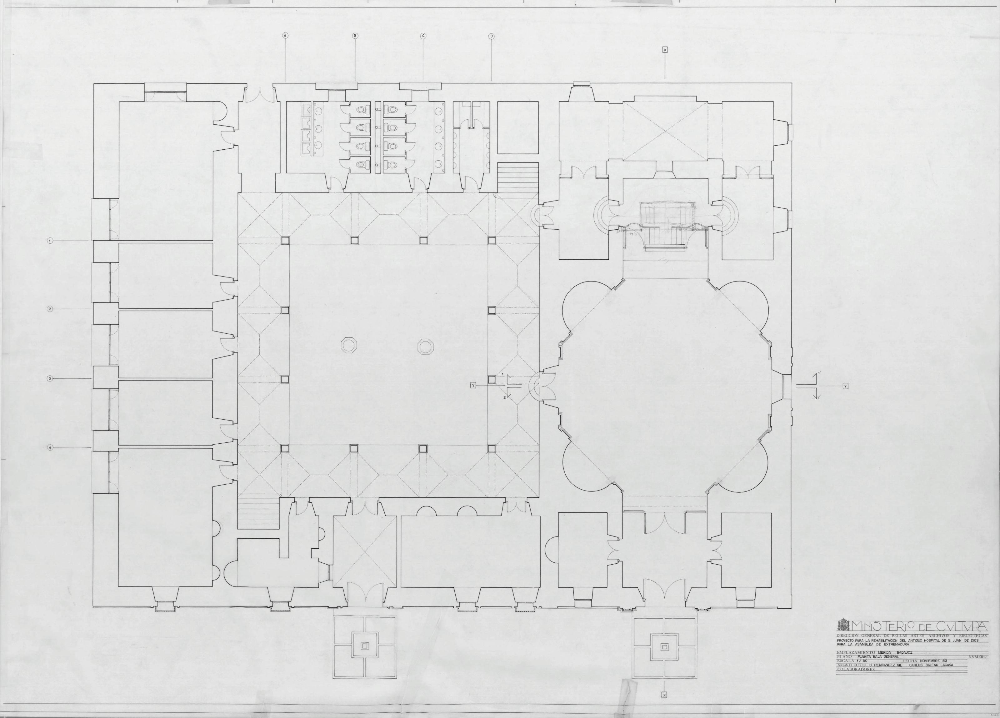 ASAMBLEA DE EXTREMADURA PROYECTO DE REHABILITACIÓN DEL ANTIGUO HOSPITAL DE S. JUAN DE DIOS PARA SEDE DE LA ASAMBLEA: PLANTA BAJA GENERAL Distribución. Sin cotas. Bastante detallado y alguna corrección a lápiz Con Líneas de sección 1-1¿ y 2-2¿ y varias llamadas en fachadas con números o letras rodeadas de círculo Sin firmar
