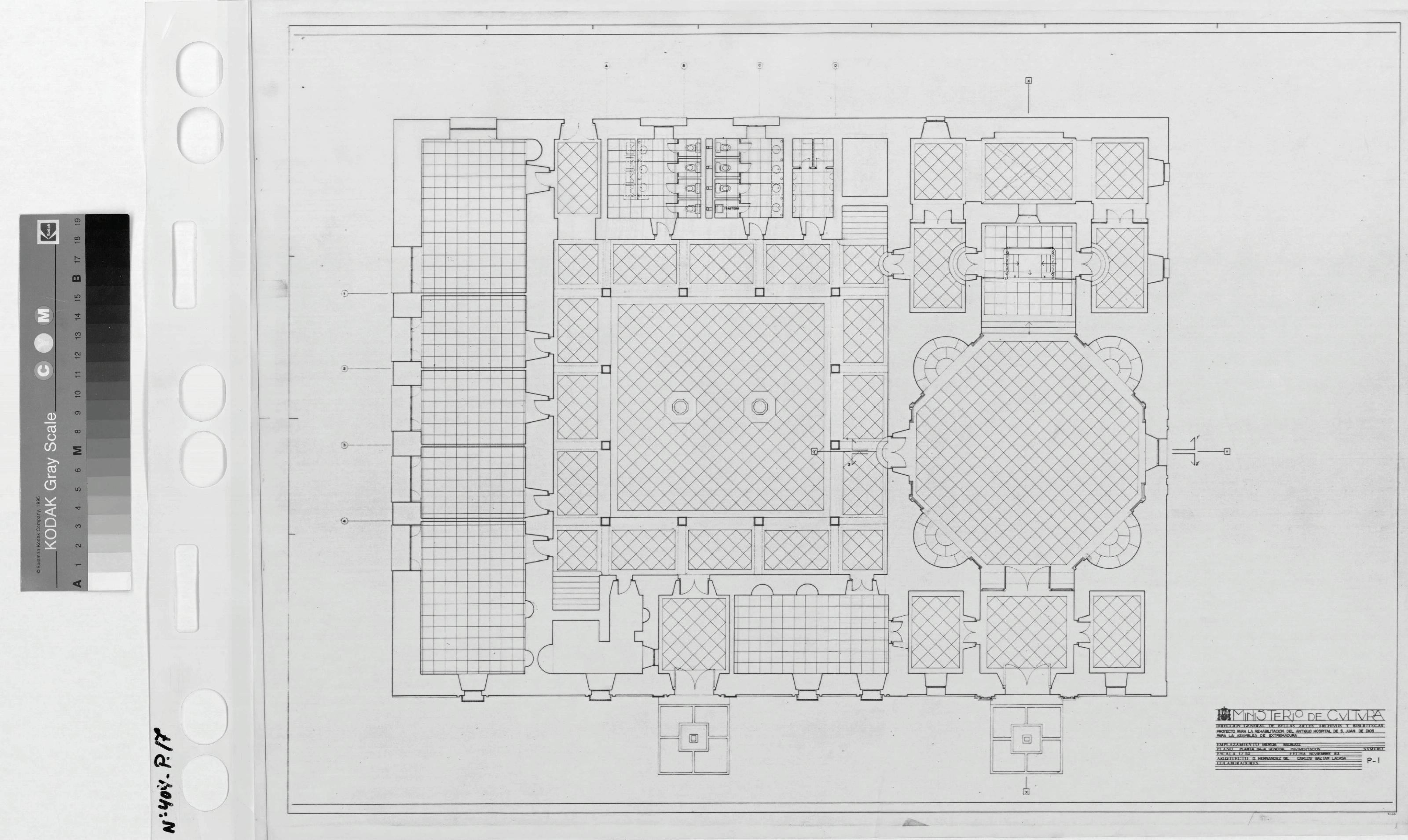 ASAMBLEA DE EXTREMADURA PROYECTO DE REHABILITACIÓN DEL ANTIGUO HOSPITAL DE S. JUAN DE DIOS PARA SEDE DE LA ASAMBLEA: PLANTA BAJA GENERAL Pavimentación Despiece de Solados en todas las estancias Con Líneas de sección 1-1¿ y 2-2¿ y varias llamadas en fachadas con números o letras rodeadas de círculo Sin firmar
