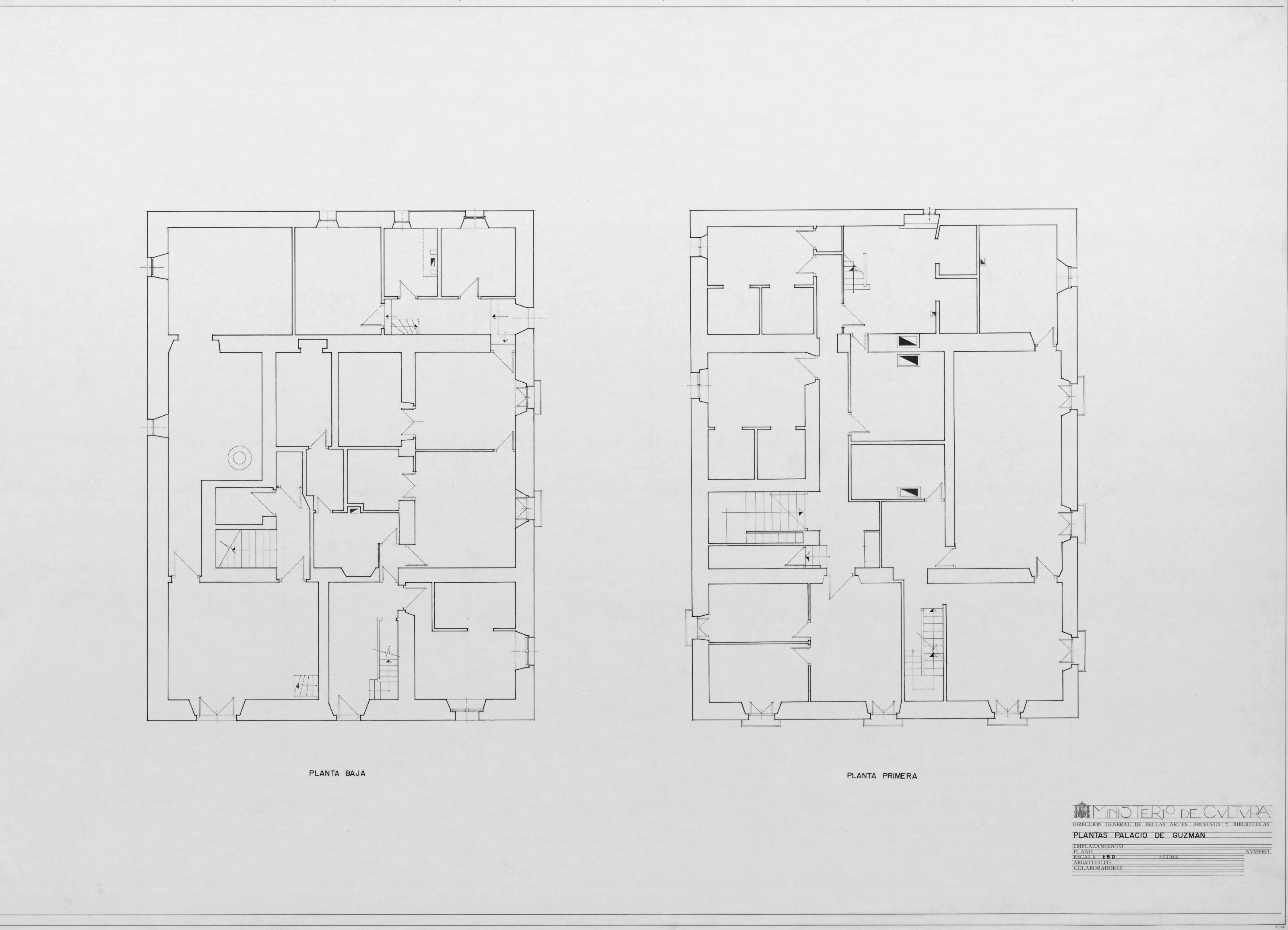PALACIO DE GUZMAN -BURGOS-: PLANTA BAJA Y PLANTA PRIMERA.. Plantas de distribucion del palacio, plano sin cotas, dibujo sencillo de las plantas con los muros regruesados..Estos planos estan realizados por personas contratadas por el INEM.