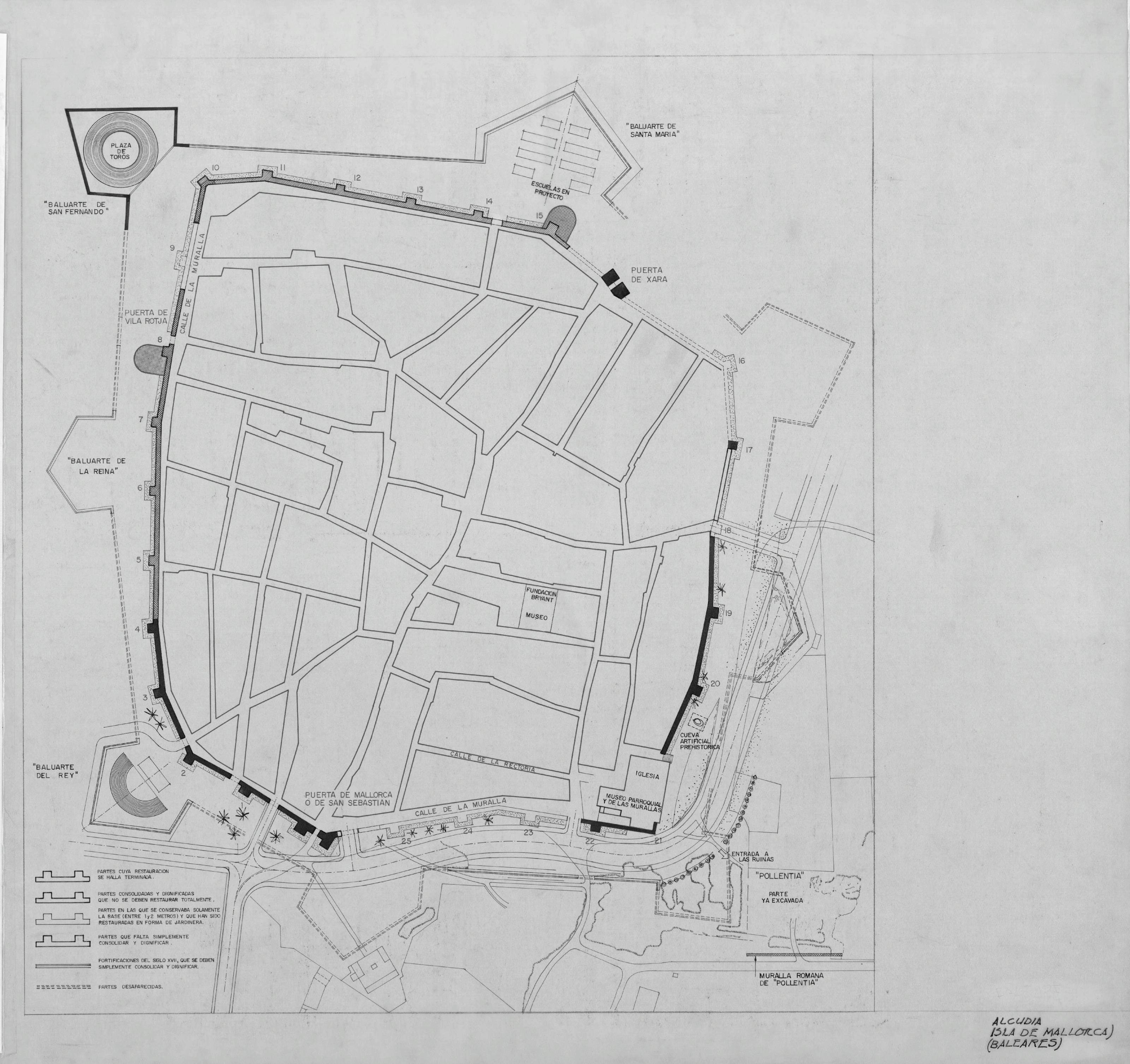 CONJUNTO HISTORICO ARTISTICO DE ALCUDIA -MALLORCA-: PLANO DE SITUACION. Este plano describe todo el entorno a tratar, nos marca la zona restaurada terminada, partes consolidadas y dignificadas que no se deben restaurar totalmente, parte que se conserva la base, partes desaparecidas etc.