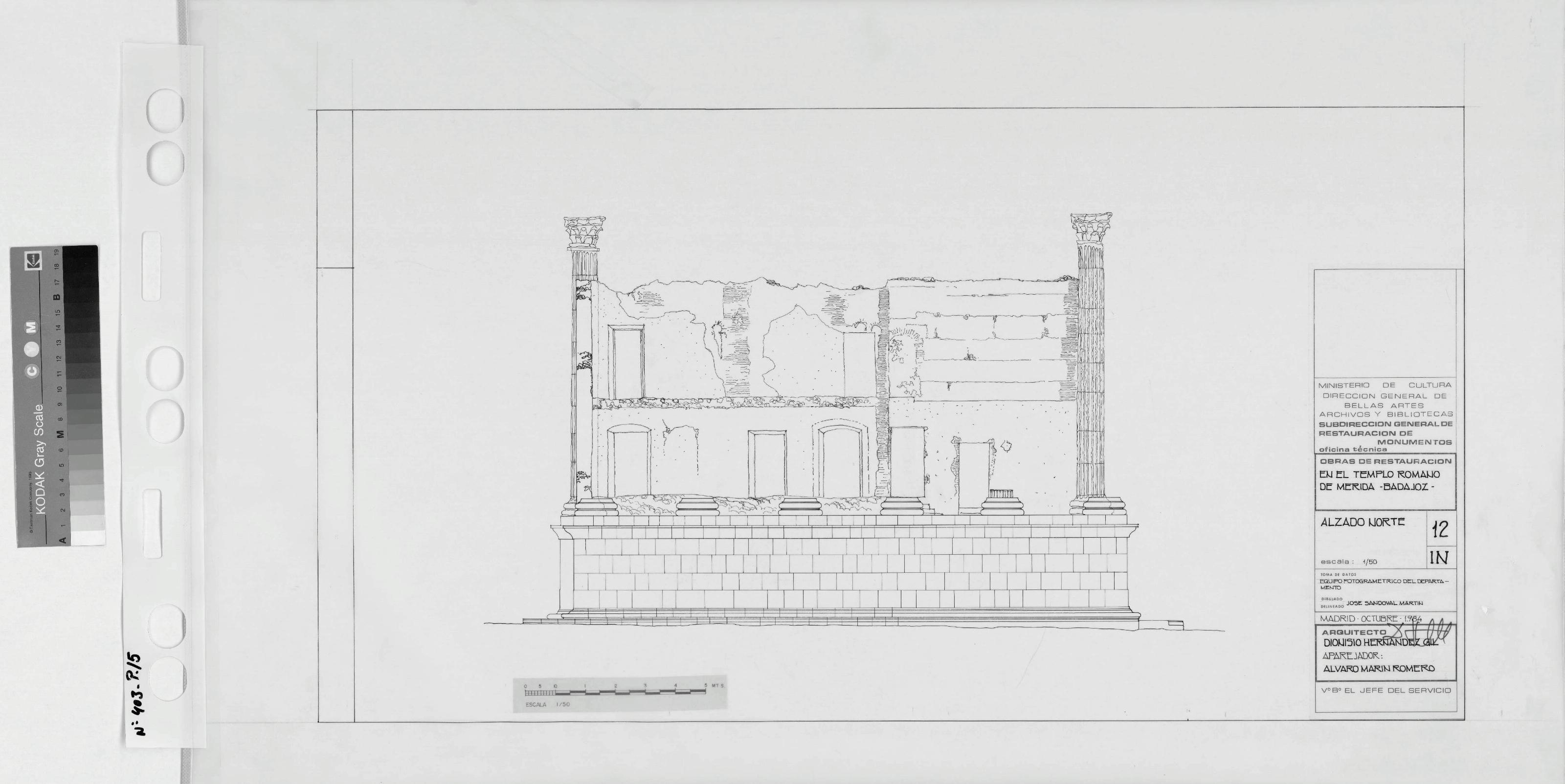 OBRAS DE RESTAURACION EN EL TEMPLO ROMANO DE MERIDA (Badajoz): ALZADO NORTE Con escala gráfica y Firmado