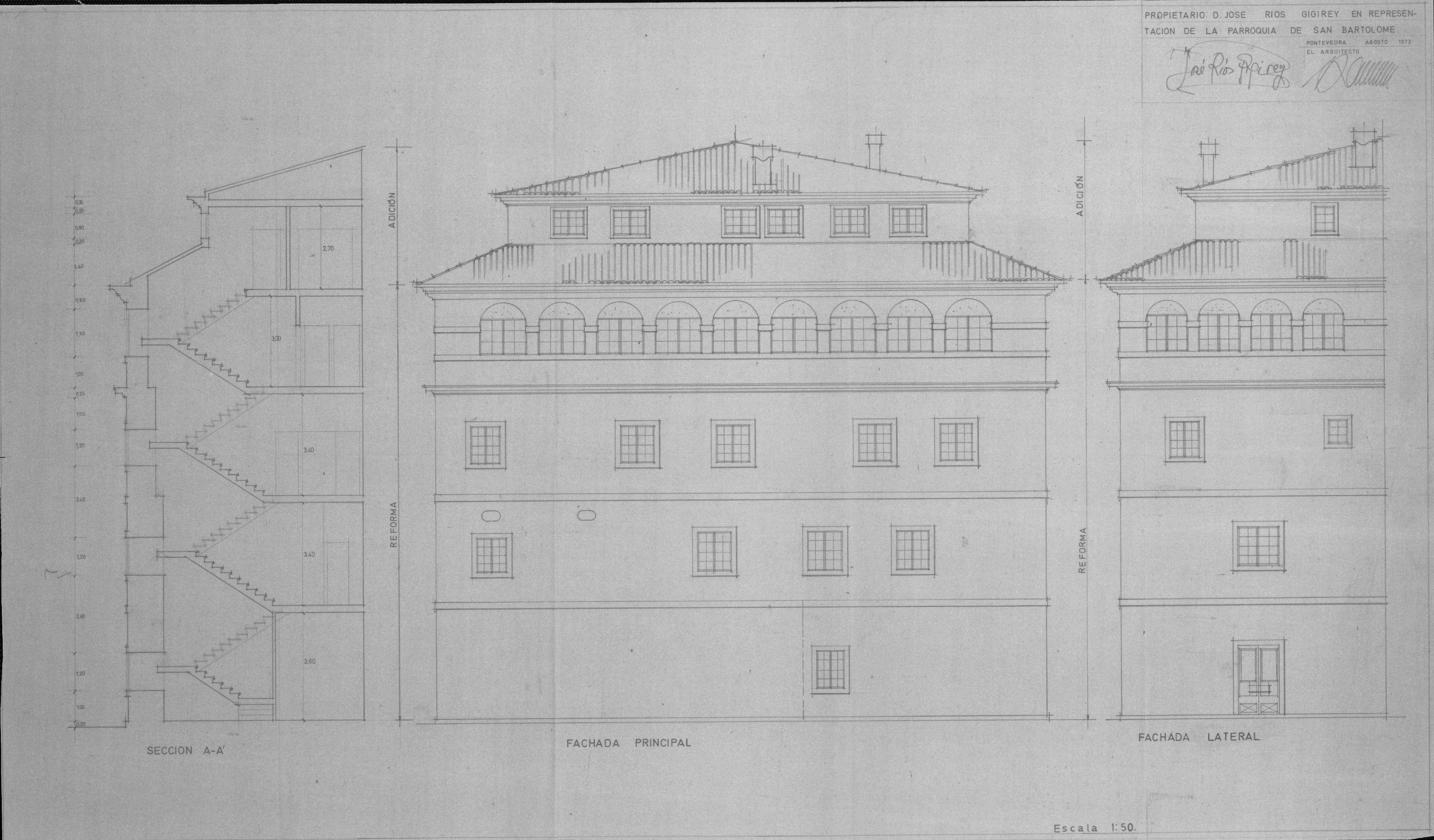 Edificio Anexo a la Iglesia de San Bartolomé: Obras de Consolidacion del edificio parroquial de San Bartolomé Fachada Lateral Fachada Principal Sección A-A'