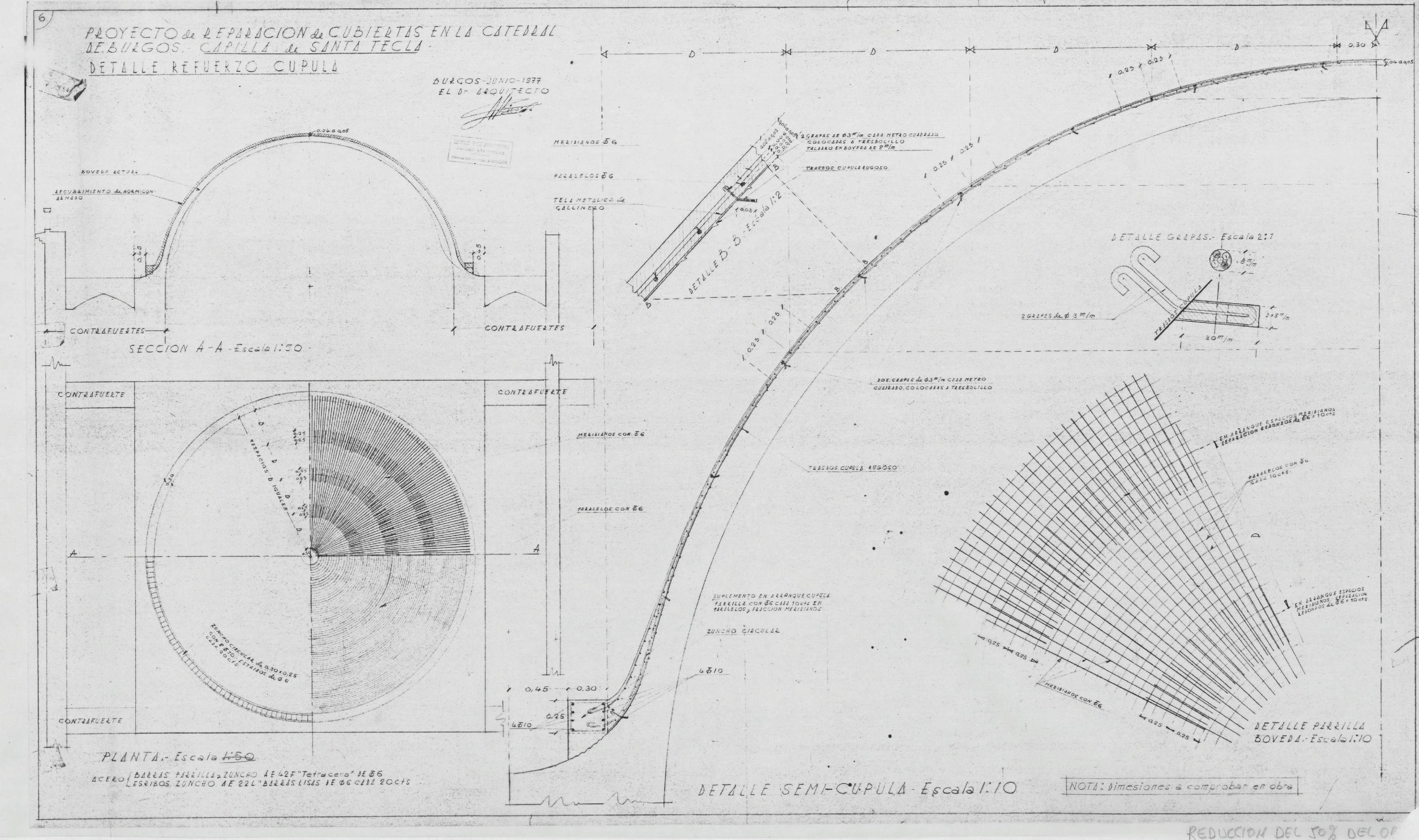 CATEDRAL DE BURGOS CAPILLA DE SANTA TECLA.: CUBIERTAS CATEDRAL DE BURGOS ZONA CAPILLA DE SANTA TECLA. Plano de detalles, refuerzo cupula , planta, y detalle semi-cupula, plano reducido.