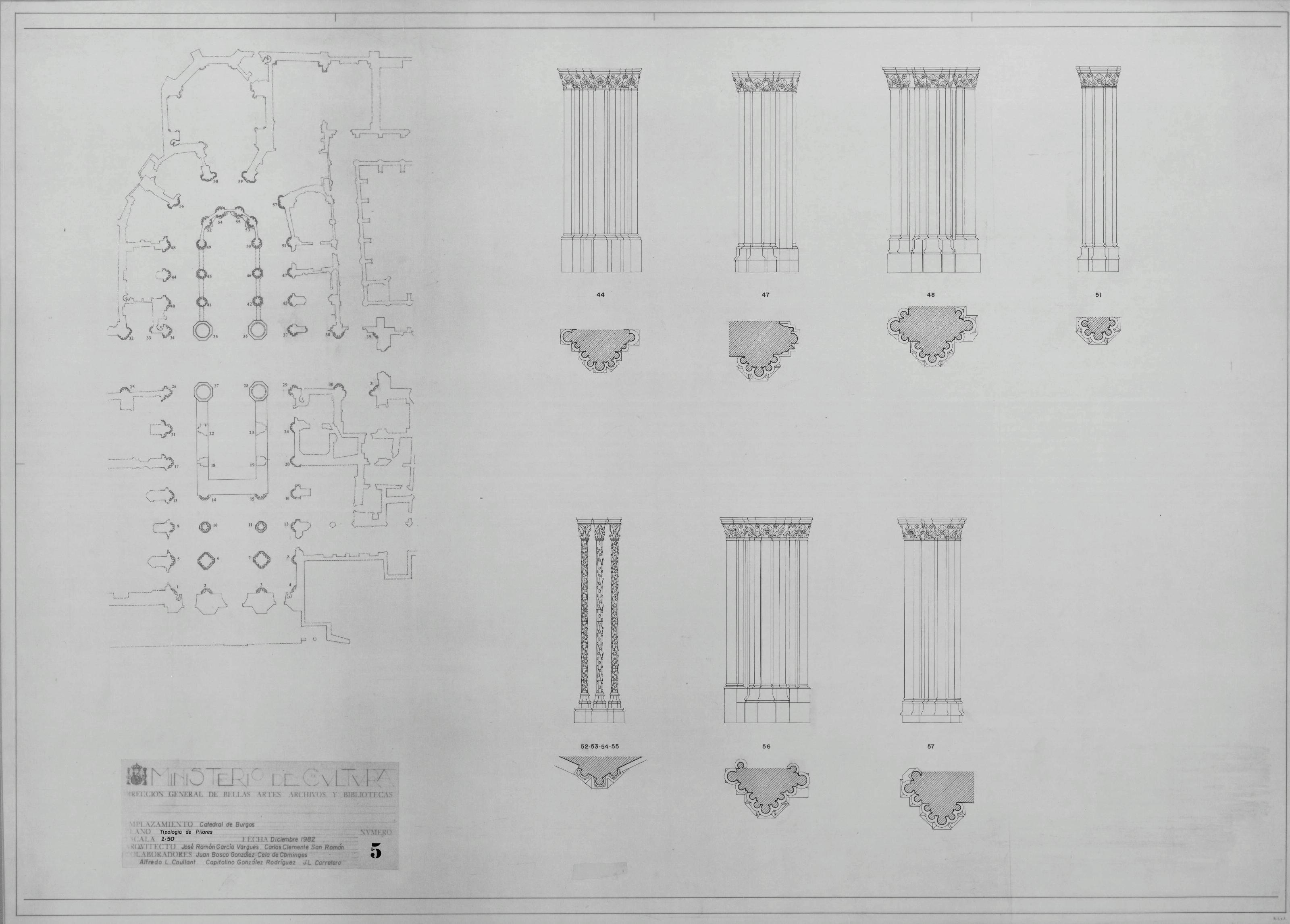 CATEDRAL DE BURGOS: PLANO, TIPOLOGIA DE PILARES. Detalles de pilares, plantas, alzados y seccion, plano sin cotas.plano 5