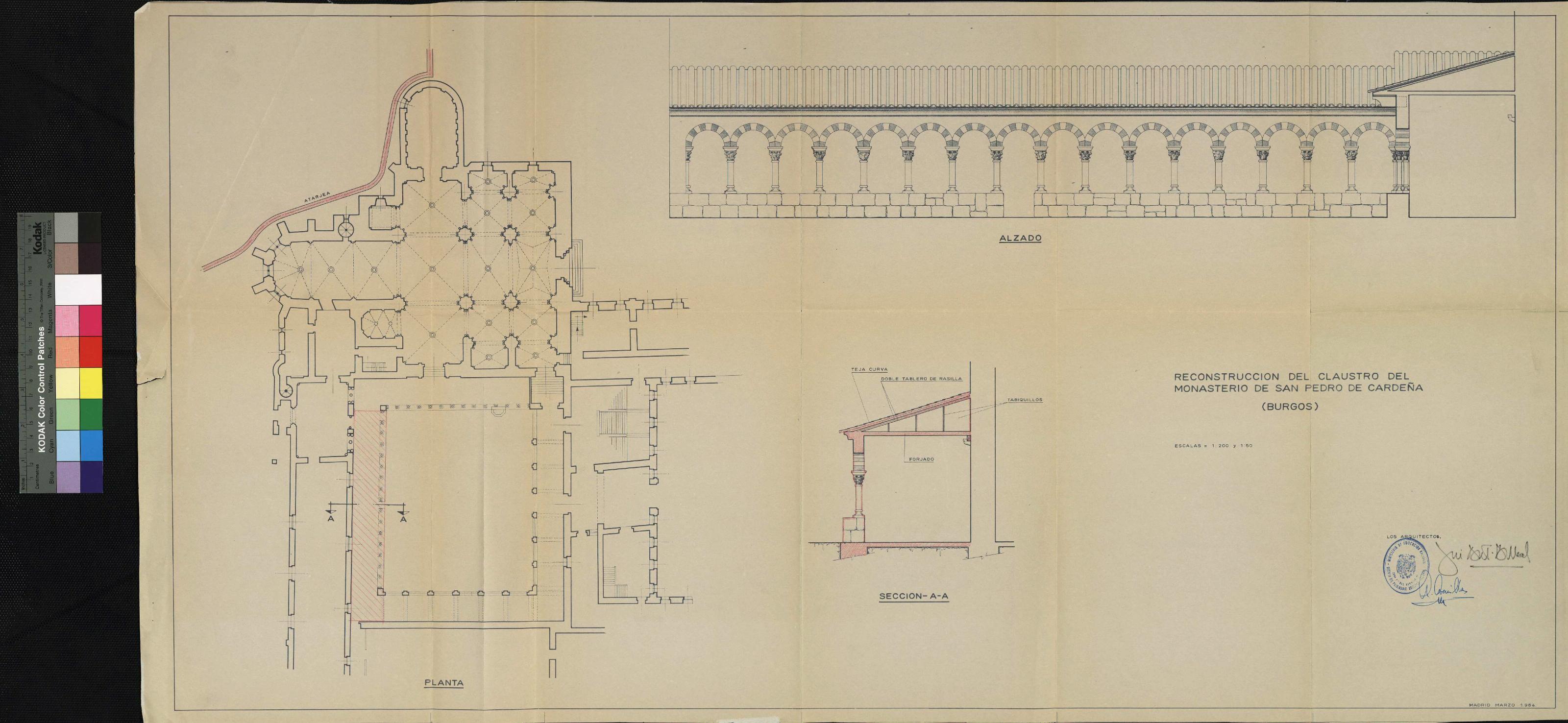 Monasterio de San Pedro de Cerdeña. Castrillo del Val. Burgos.: Reconstrucción del claustro. Planta, alzado y sección por el claustro.