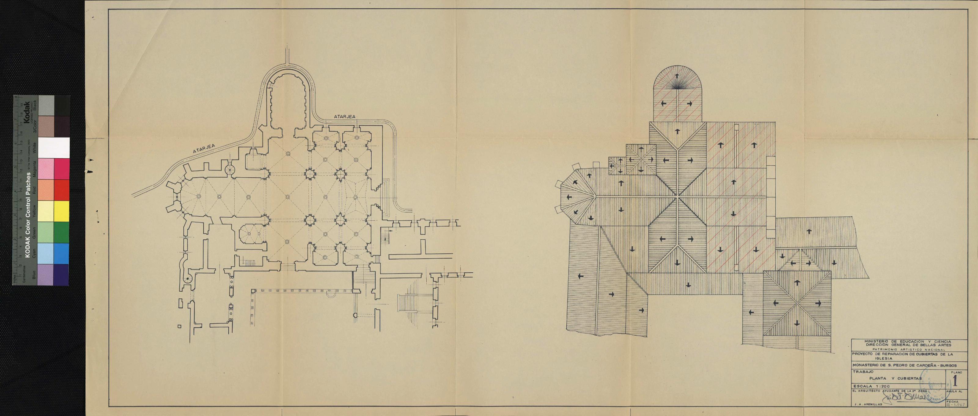 Monasterio de San Pedro de Cerdeña. Castrillo del Val. Burgos.: Reparación de cubiertas y saneamiento de la Capilla del Cid y de la cubierta de la Iglesia y Sala Capitular. Planta general y de cubiertas de la iglesia, marcando las zonas a reparar.