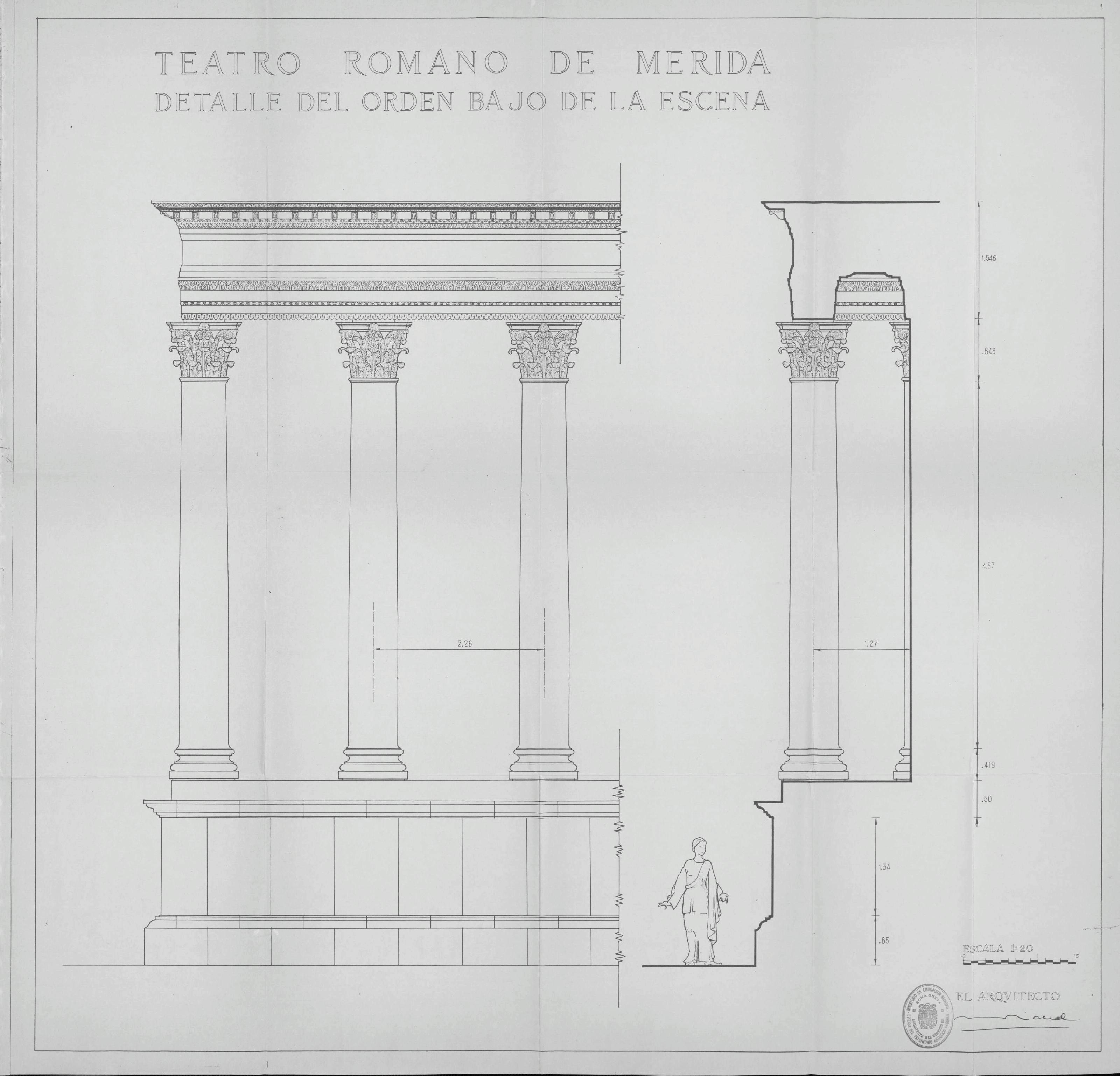 TEATRO ROMANO. MÉRIDA.: DETALLE DEL ORDEN BAJO DE LA ESCENA.