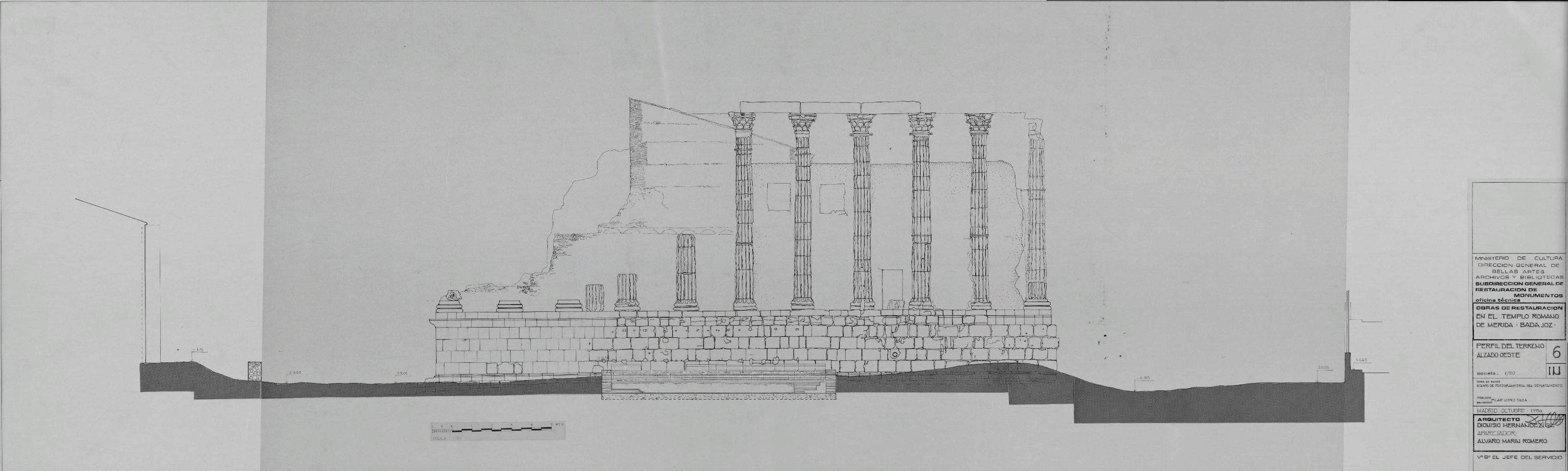 TEMPLO ROMANO DE MERIDA: PUPIL DEL TERRENO. ALZADO OESTE.