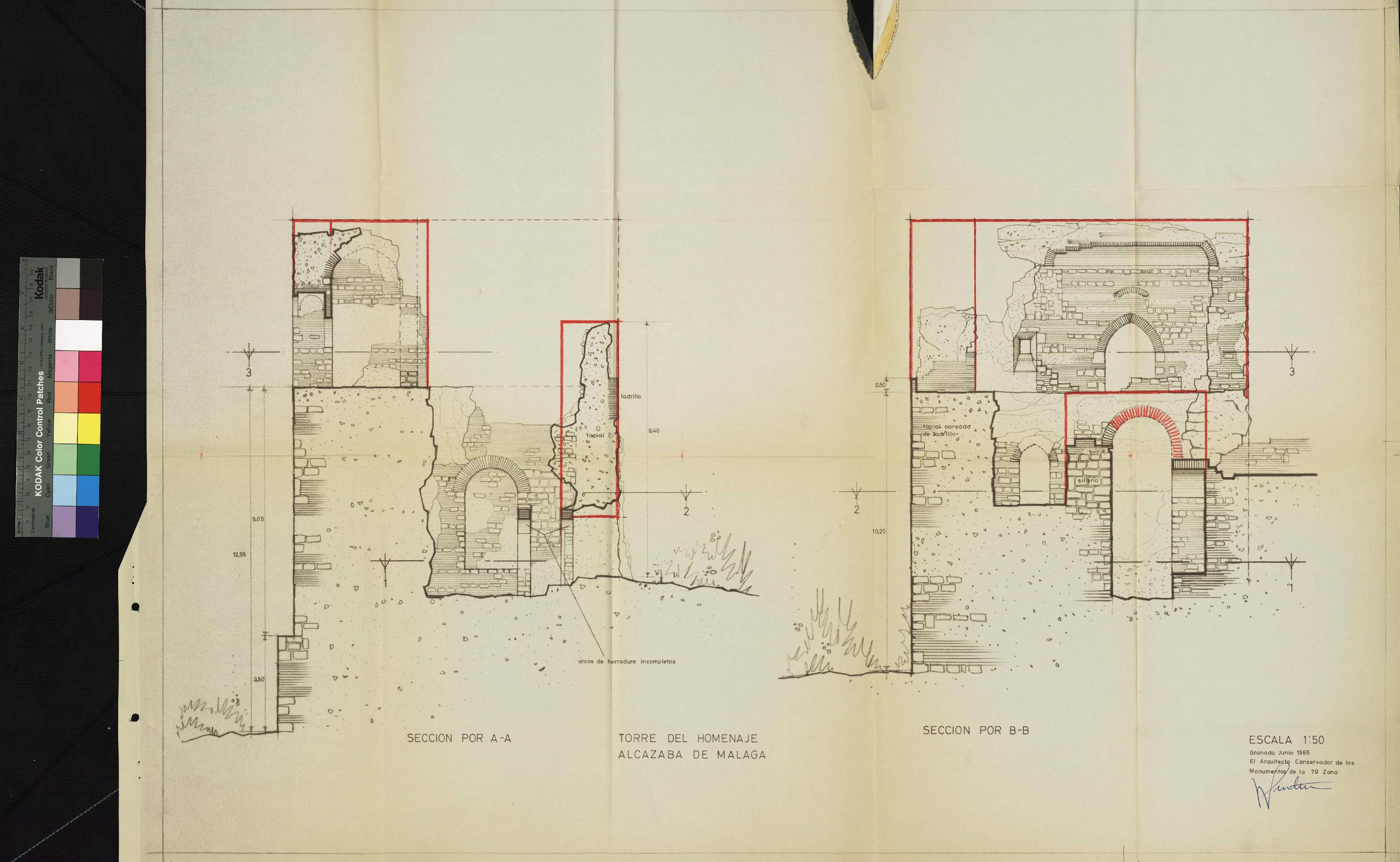 Alcazaba de Málaga: Alcazaba de Málaga Torre del Homenaje Secciones verticales por A-A y por B-B